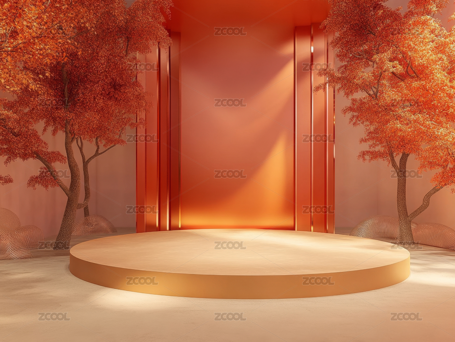 秋季,树叶,舞台,展示,背景,圆形,平台,橙色,绿色,现代