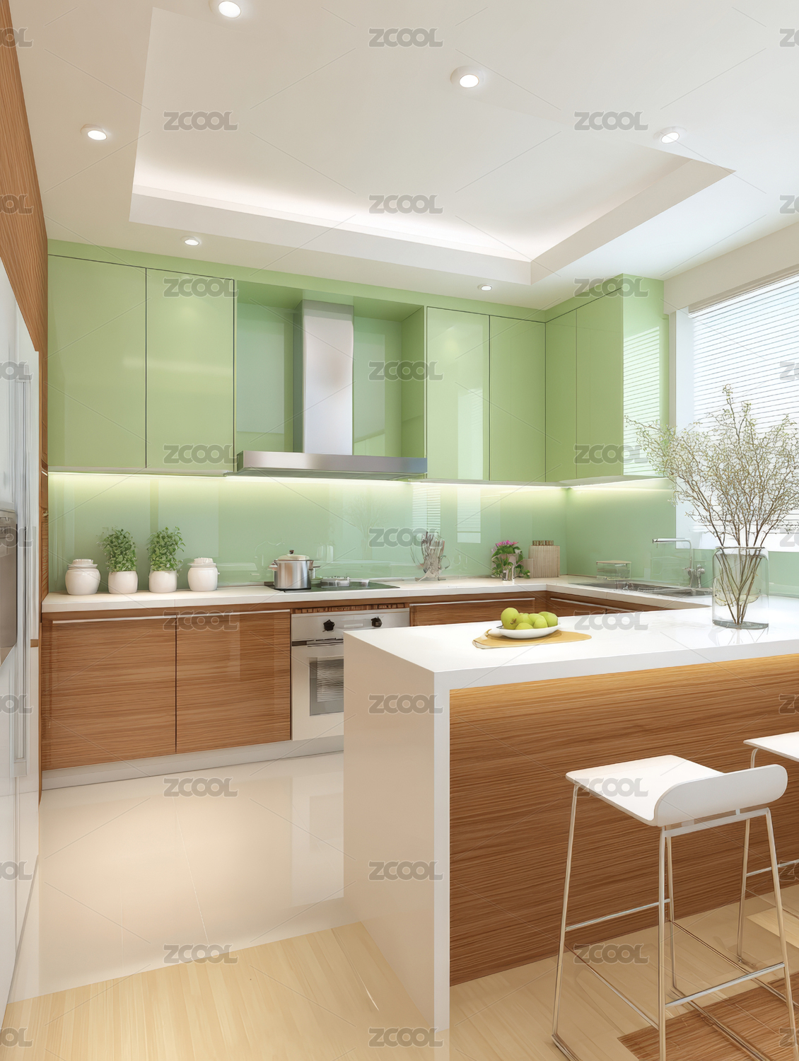 厨房,绿色,现代,室内,设计,炉灶,橱柜,餐具,光线,清洁