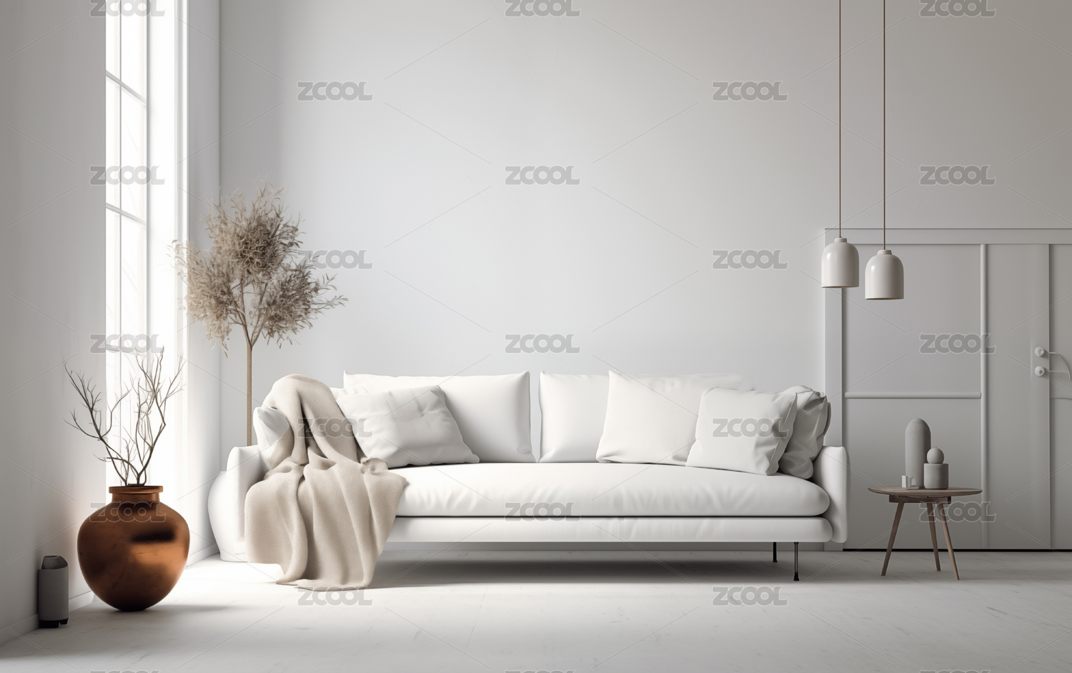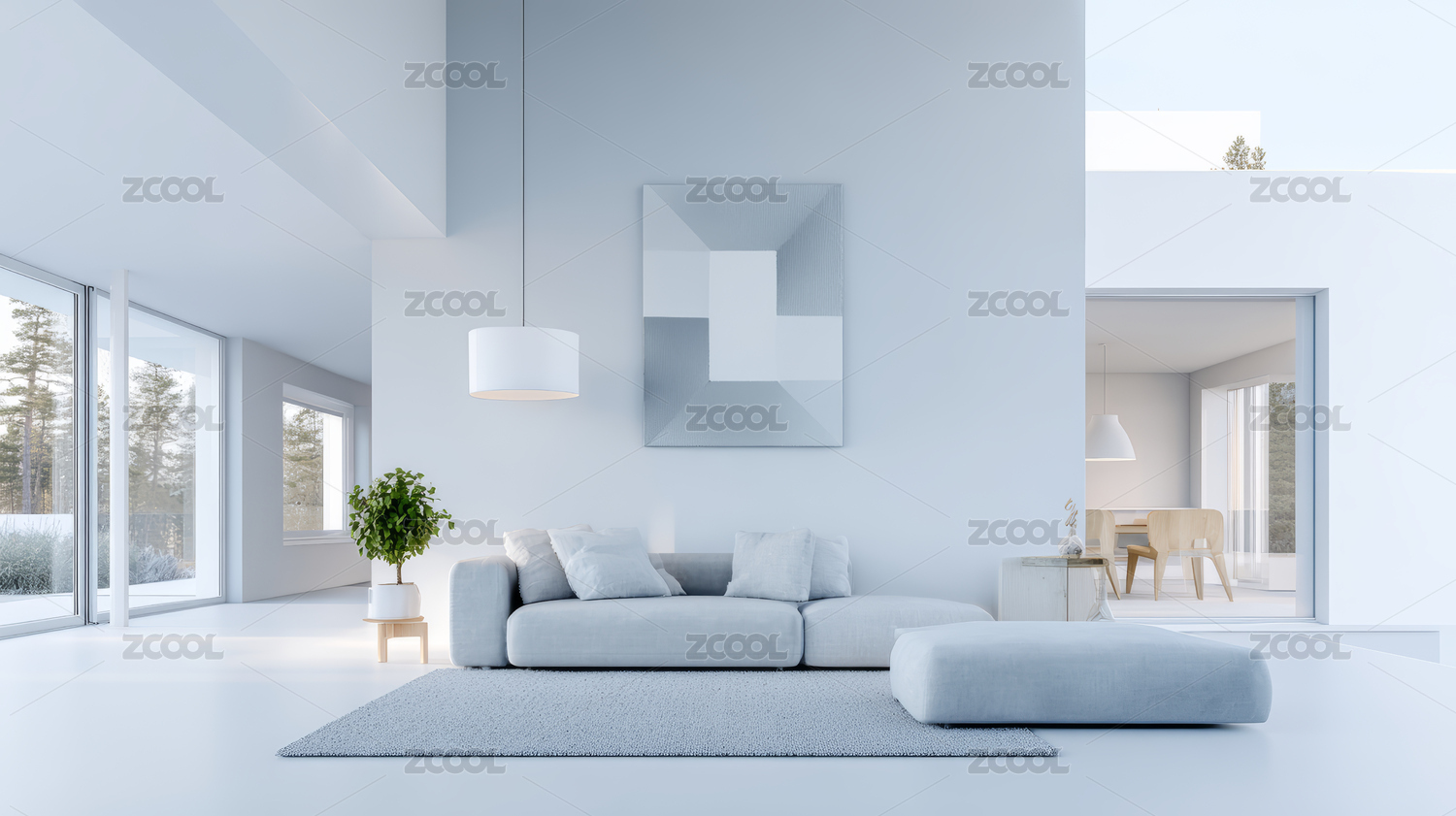 室内明亮空间的简约沙发绿植景