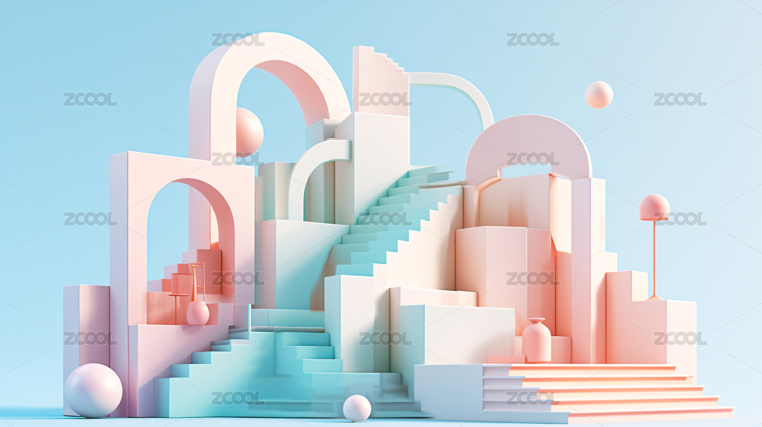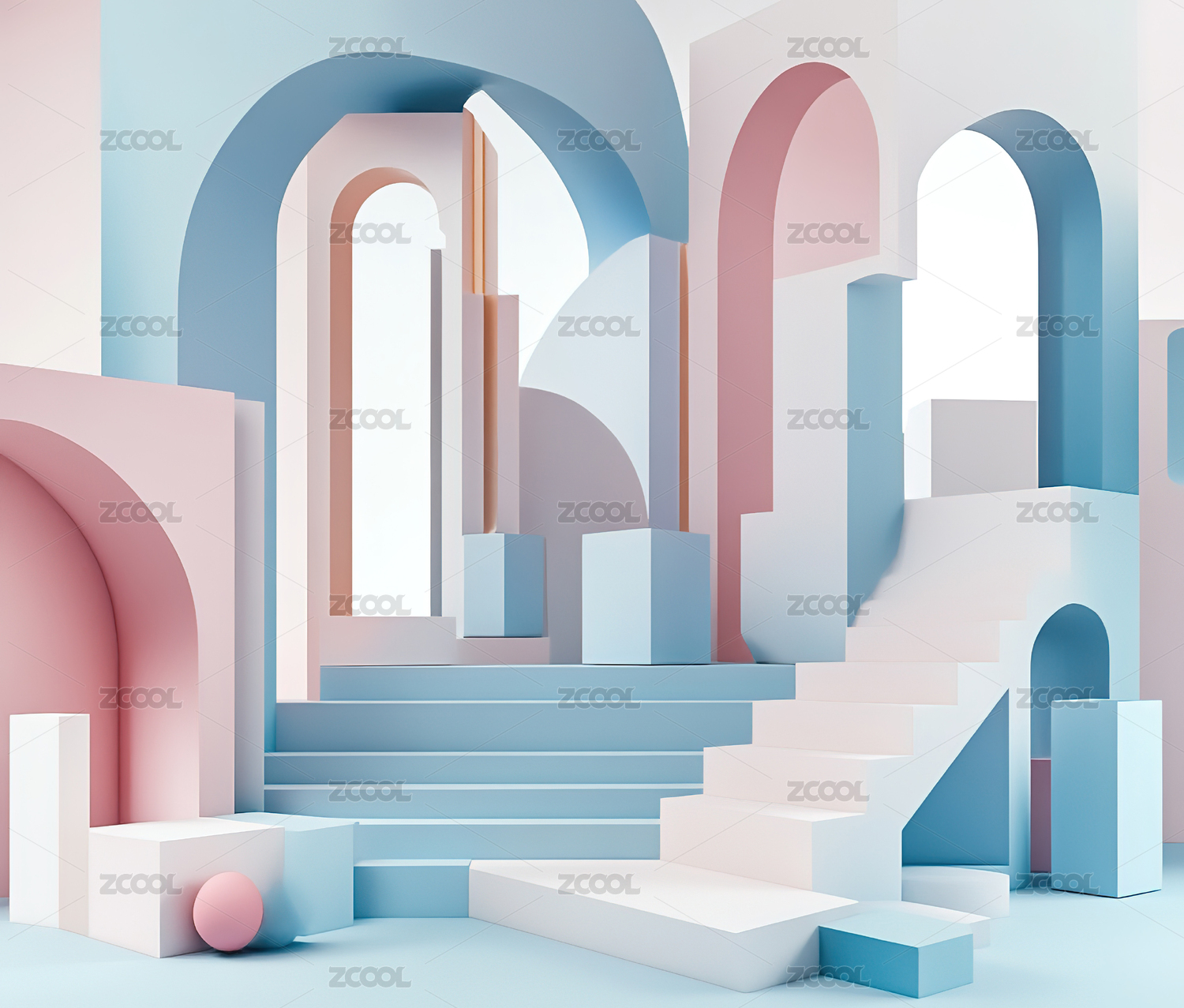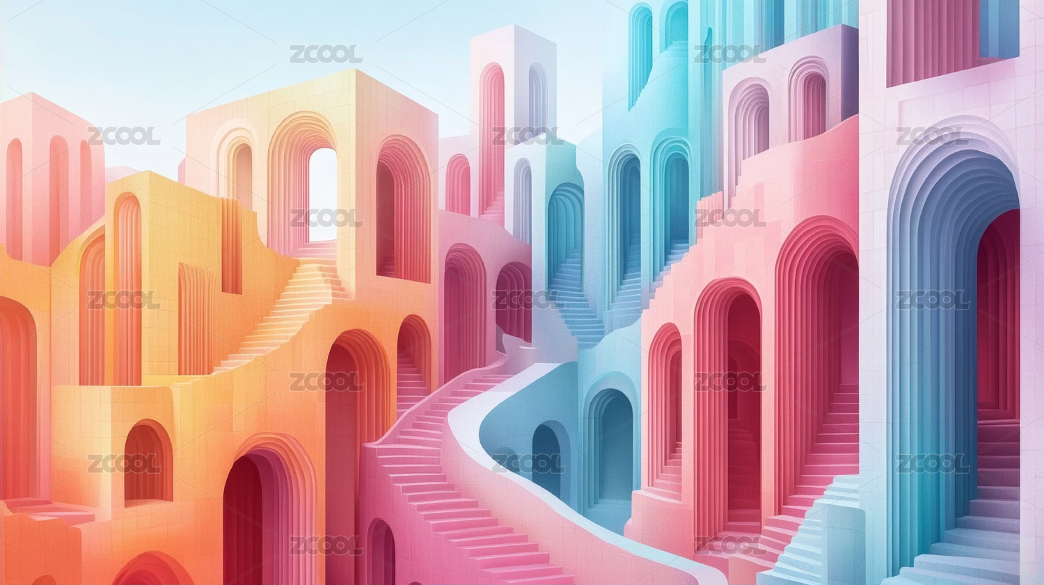 梦幻天空下的粉色抽象拱门建筑