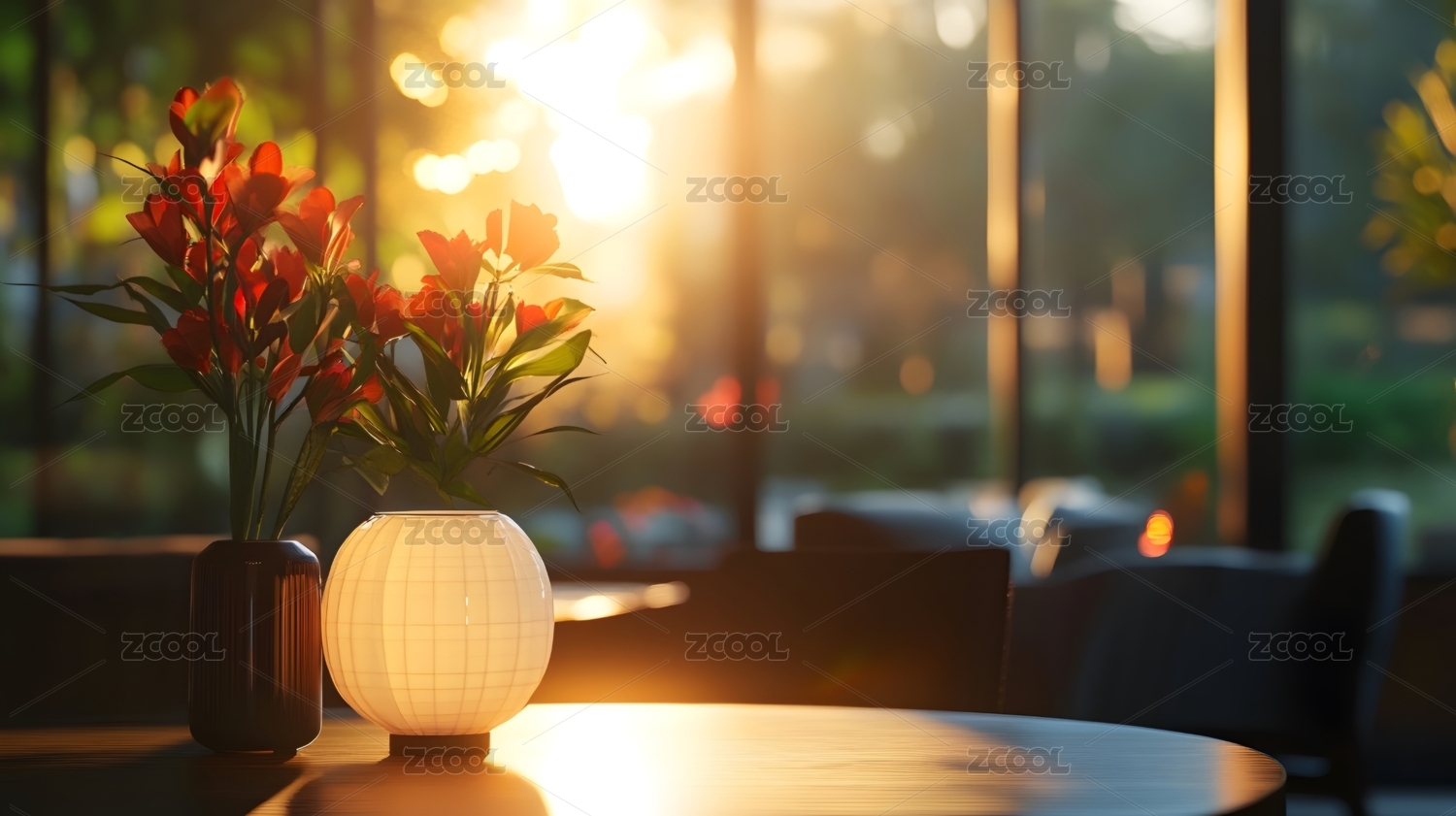 清晨阳光下的咖啡和绿植