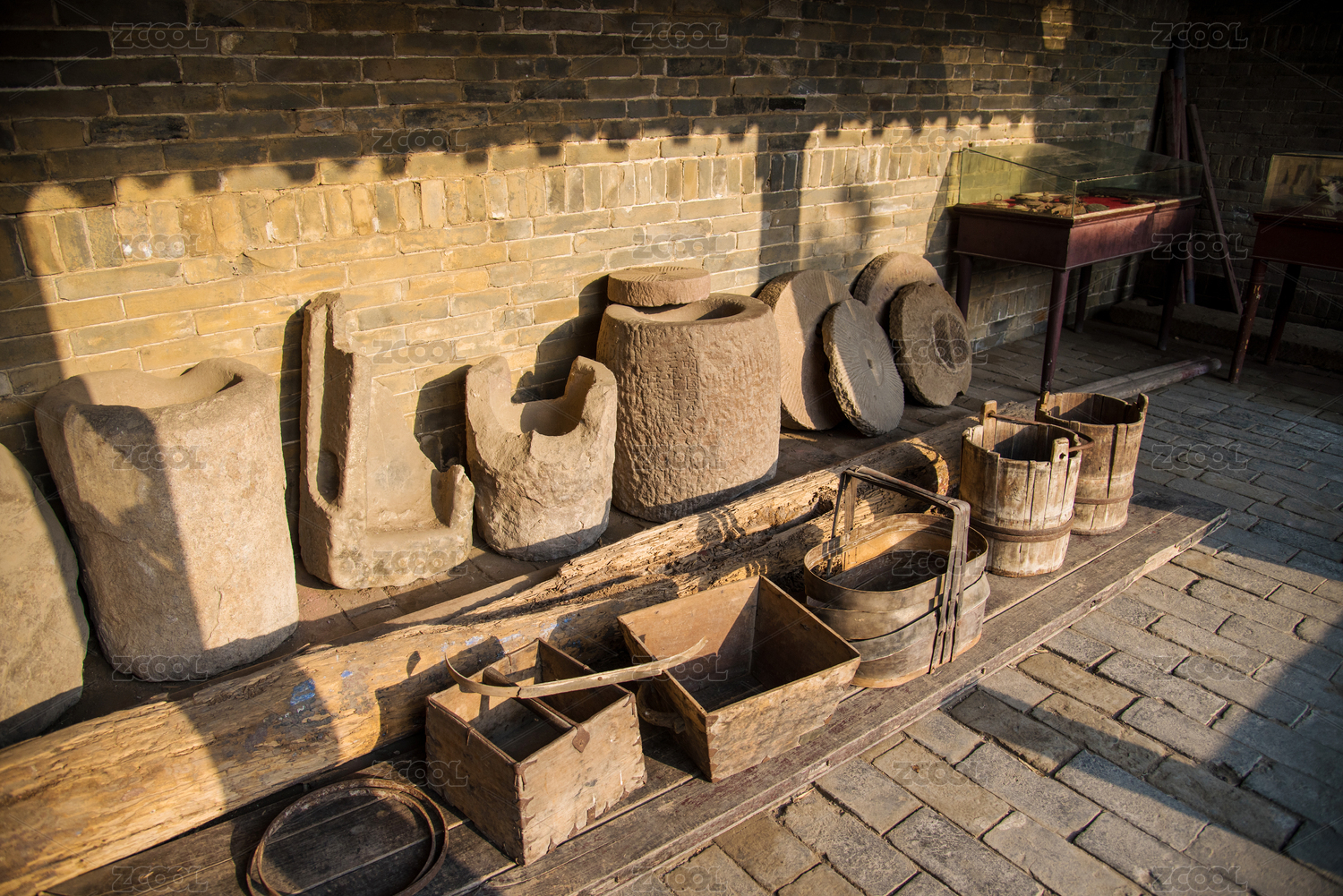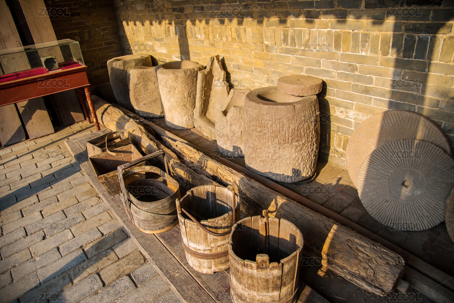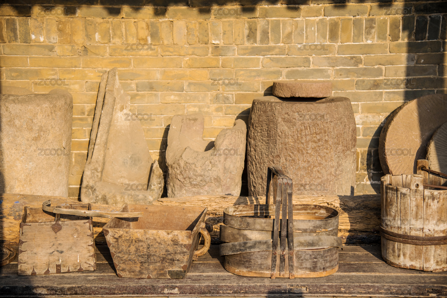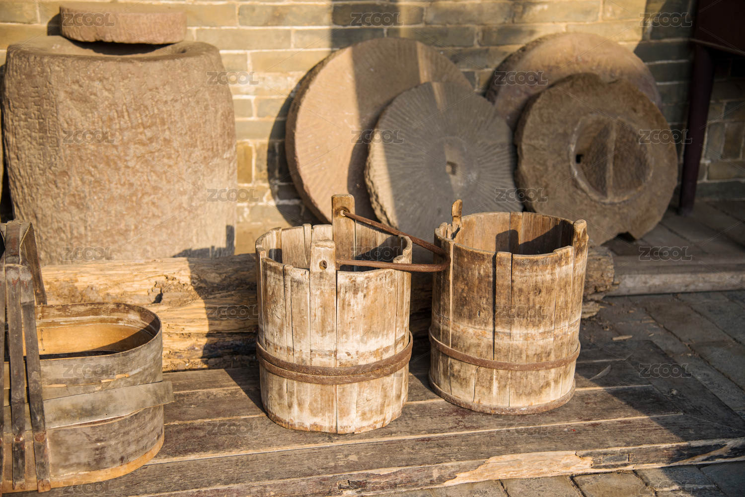 古时用的水桶和石磨碾盘特写