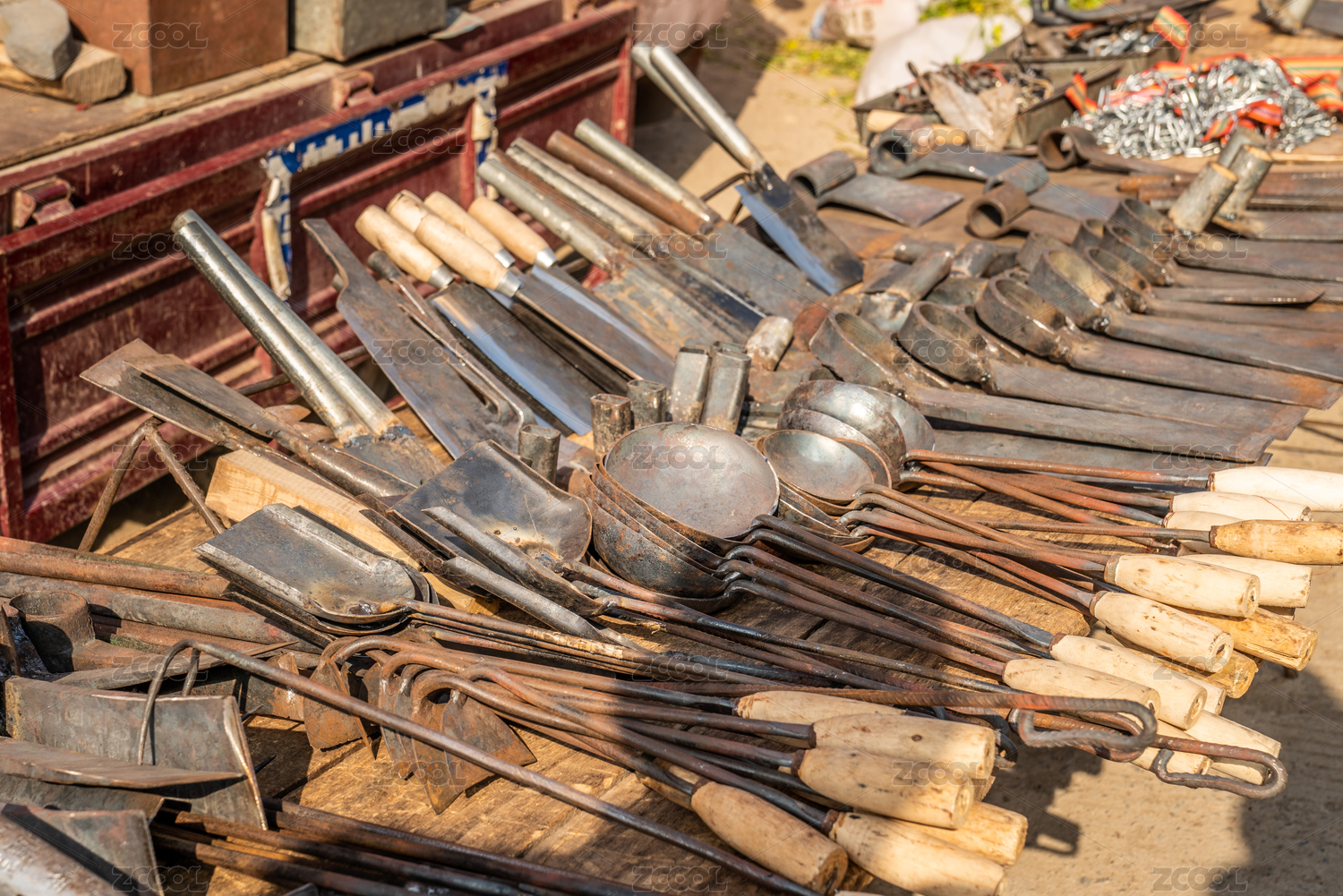 手工打造的铁制厨房用品,勺子、菜刀、钩子、铲子