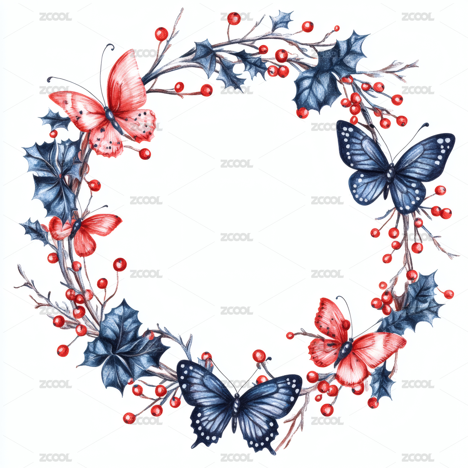 红果蓝叶花环中飞舞彩蝶