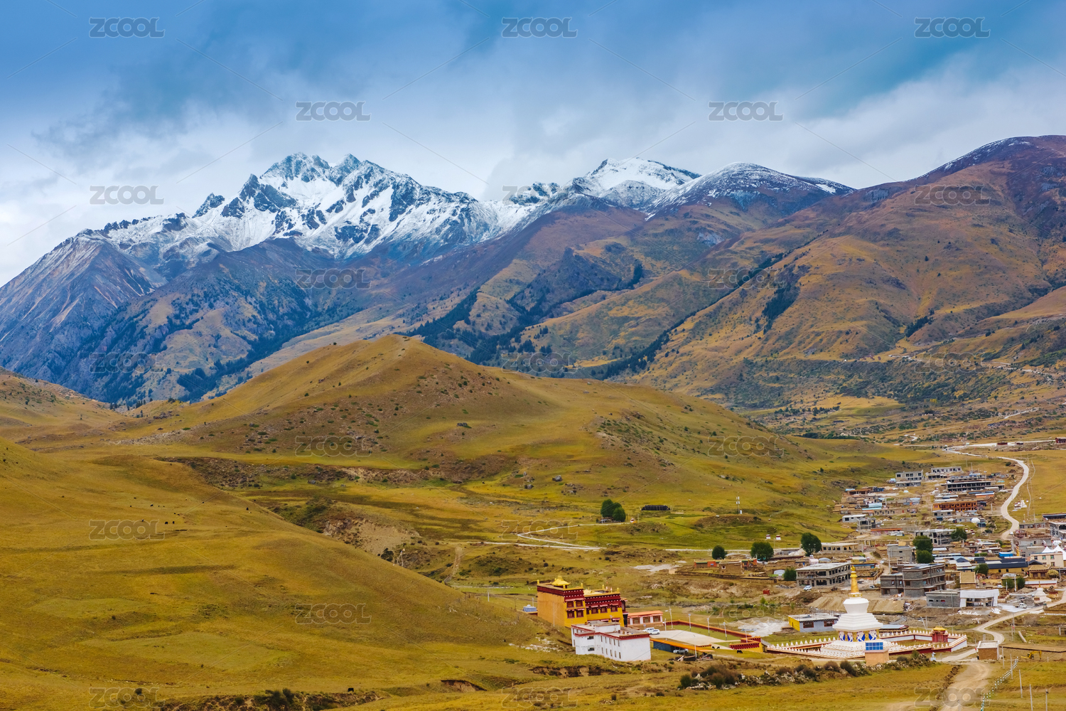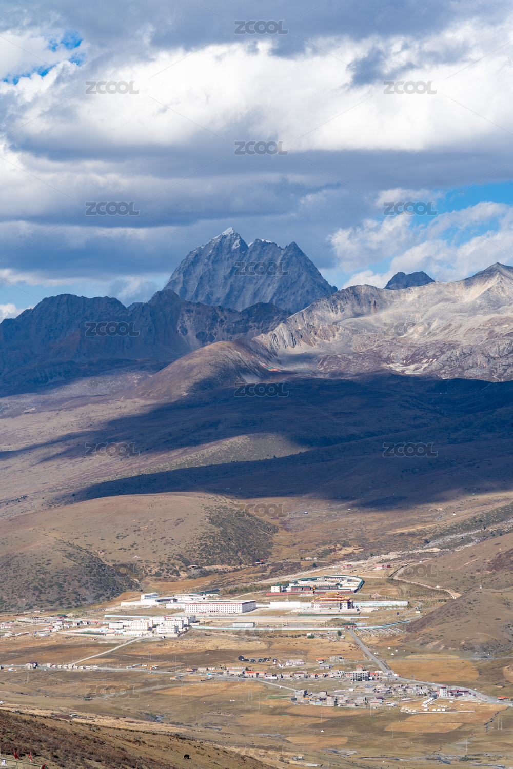 四川甘孜州雅拉雪山和山下的寺庙