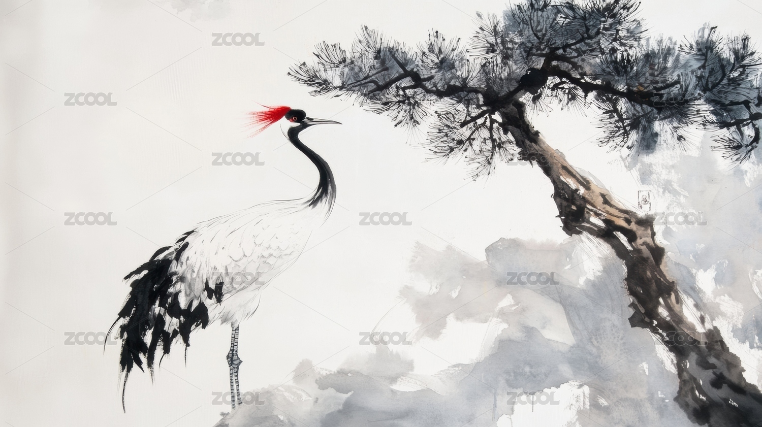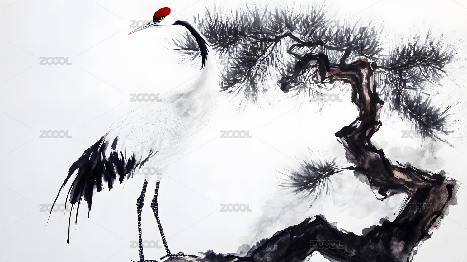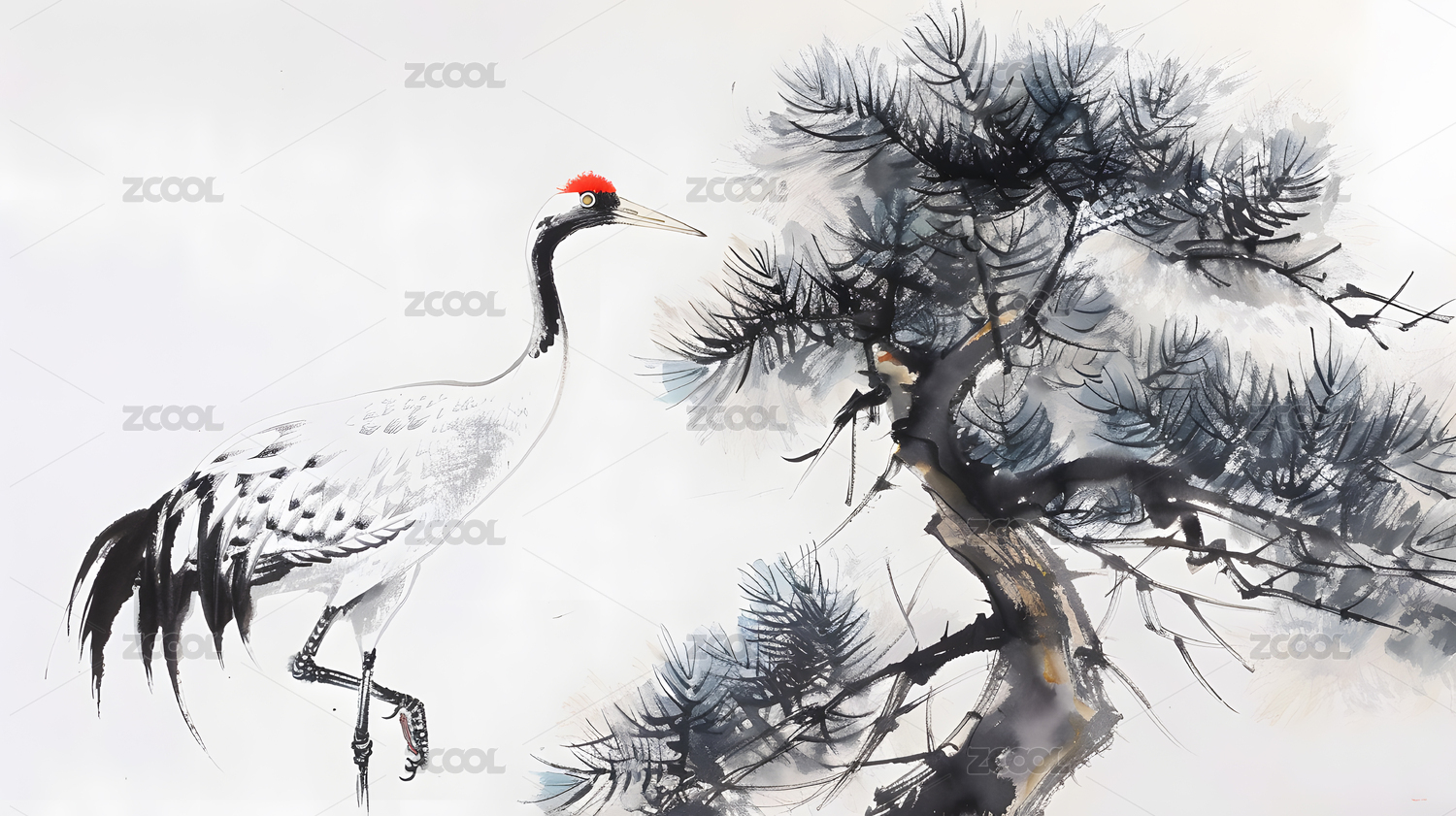 丹顶鹤,松树,水墨画,中国画,绘画,艺术,写意,优雅,自然,风景