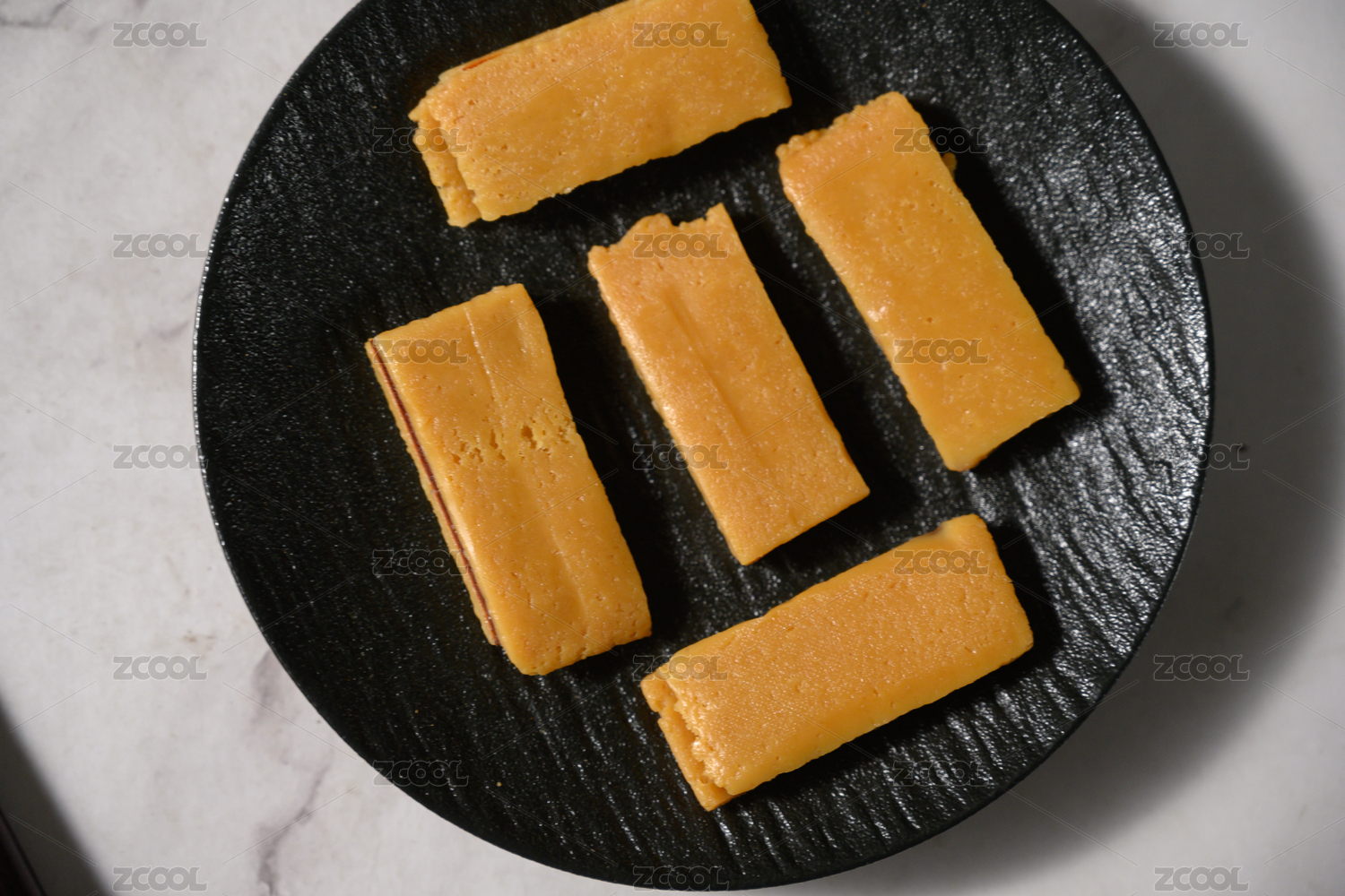 桌面上的盘子里的美味可口的夹心山楂奶糕