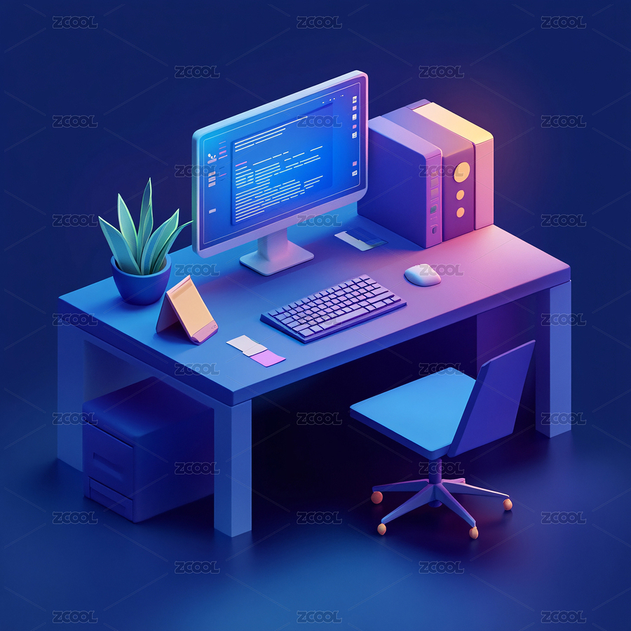 蓝色调电脑办公桌场景图