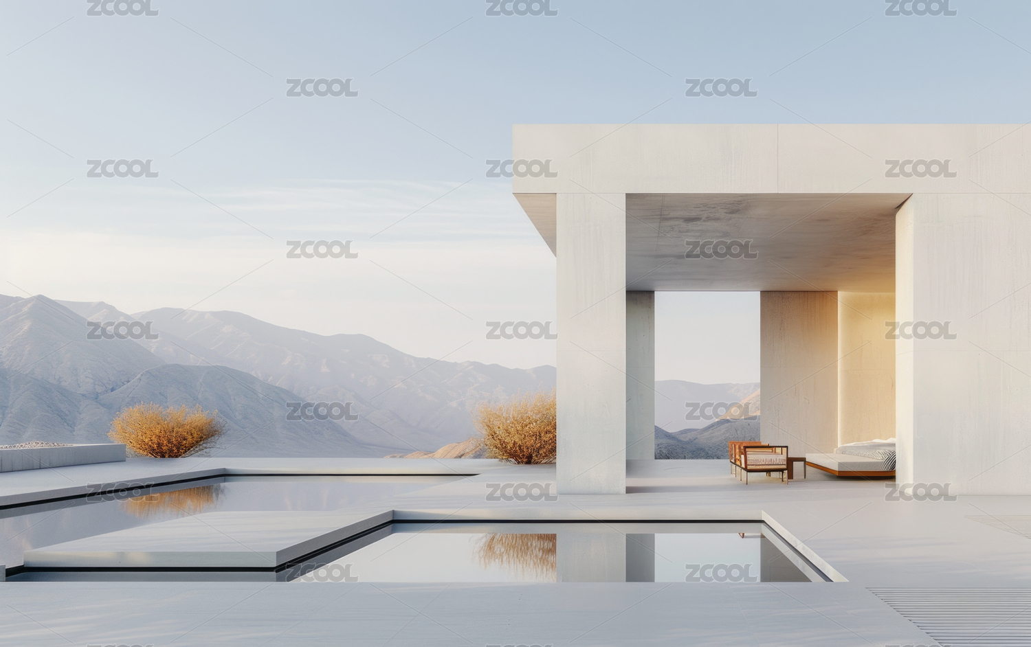 现代白色建筑与水池