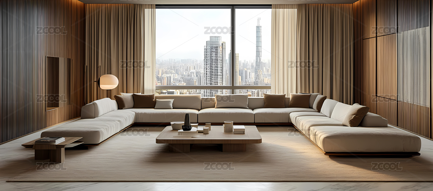 落地窗建筑内部大理石展厅带办公桌沙发窗外