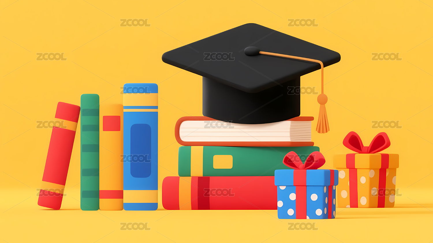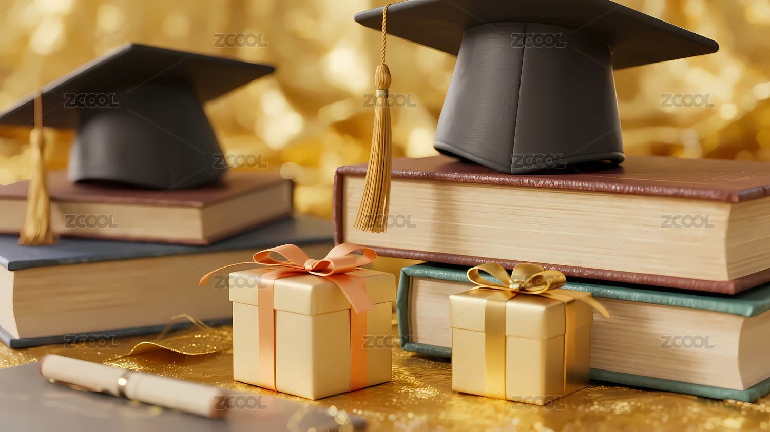 毕业帽下的礼物与书籍堆叠
