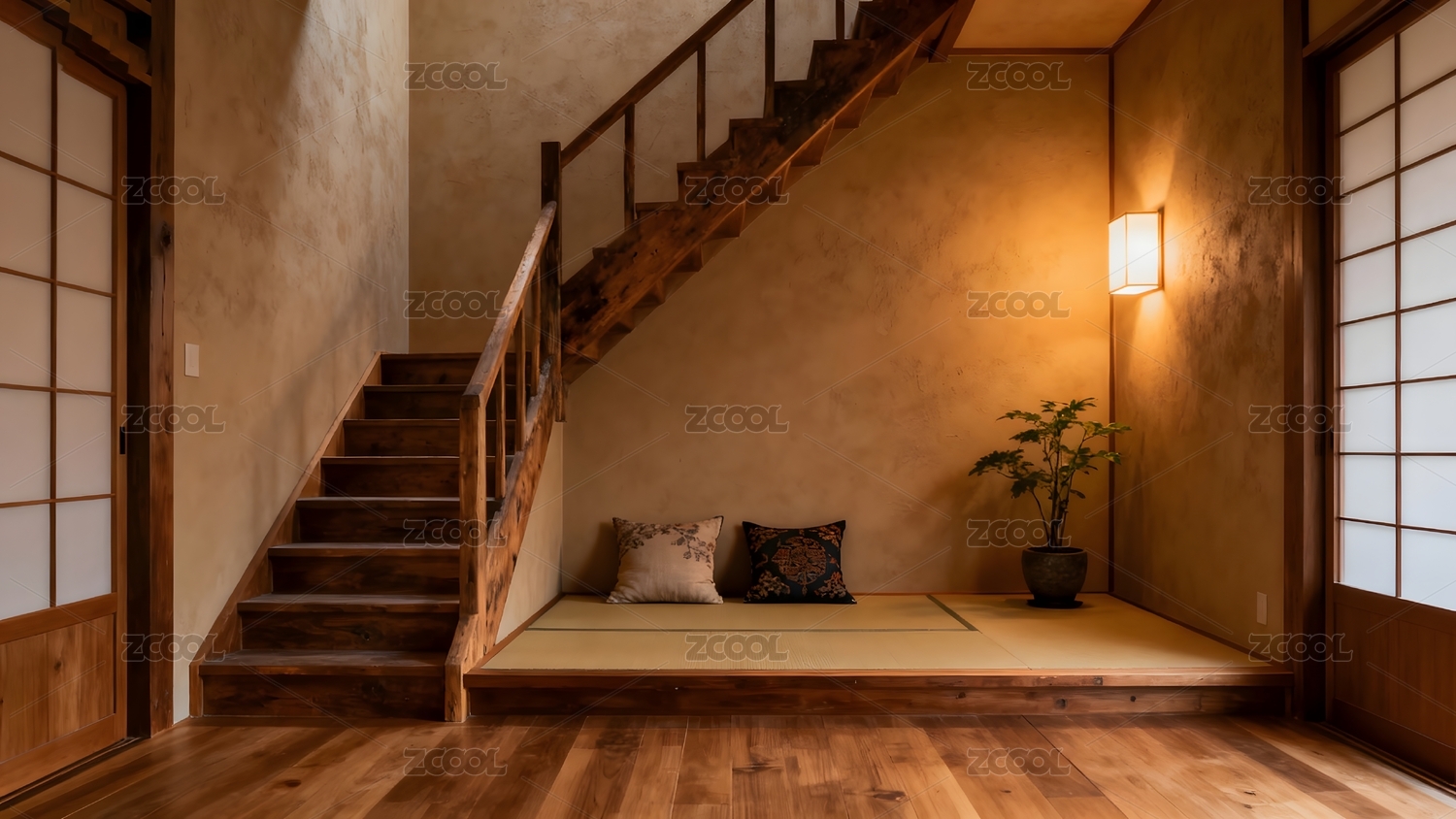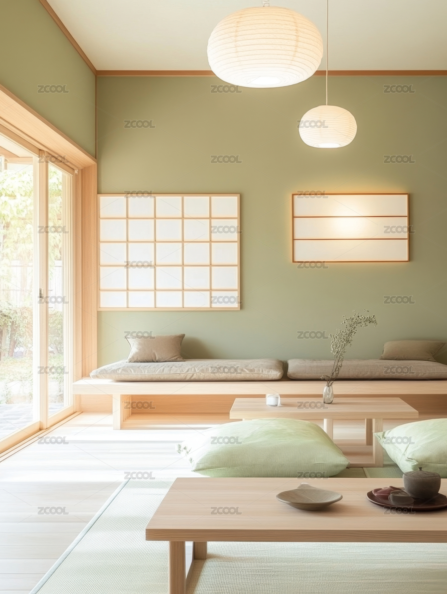 客厅,日式,风格,绿色,墙壁,木质,家具,沙发,餐桌,窗户