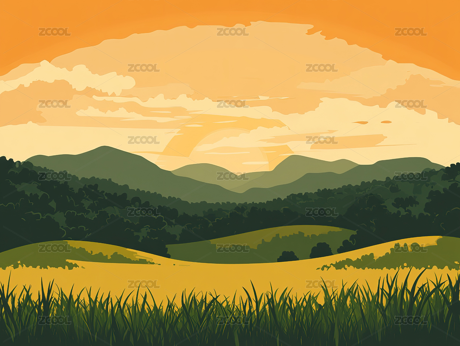 扁平风格草地和远山