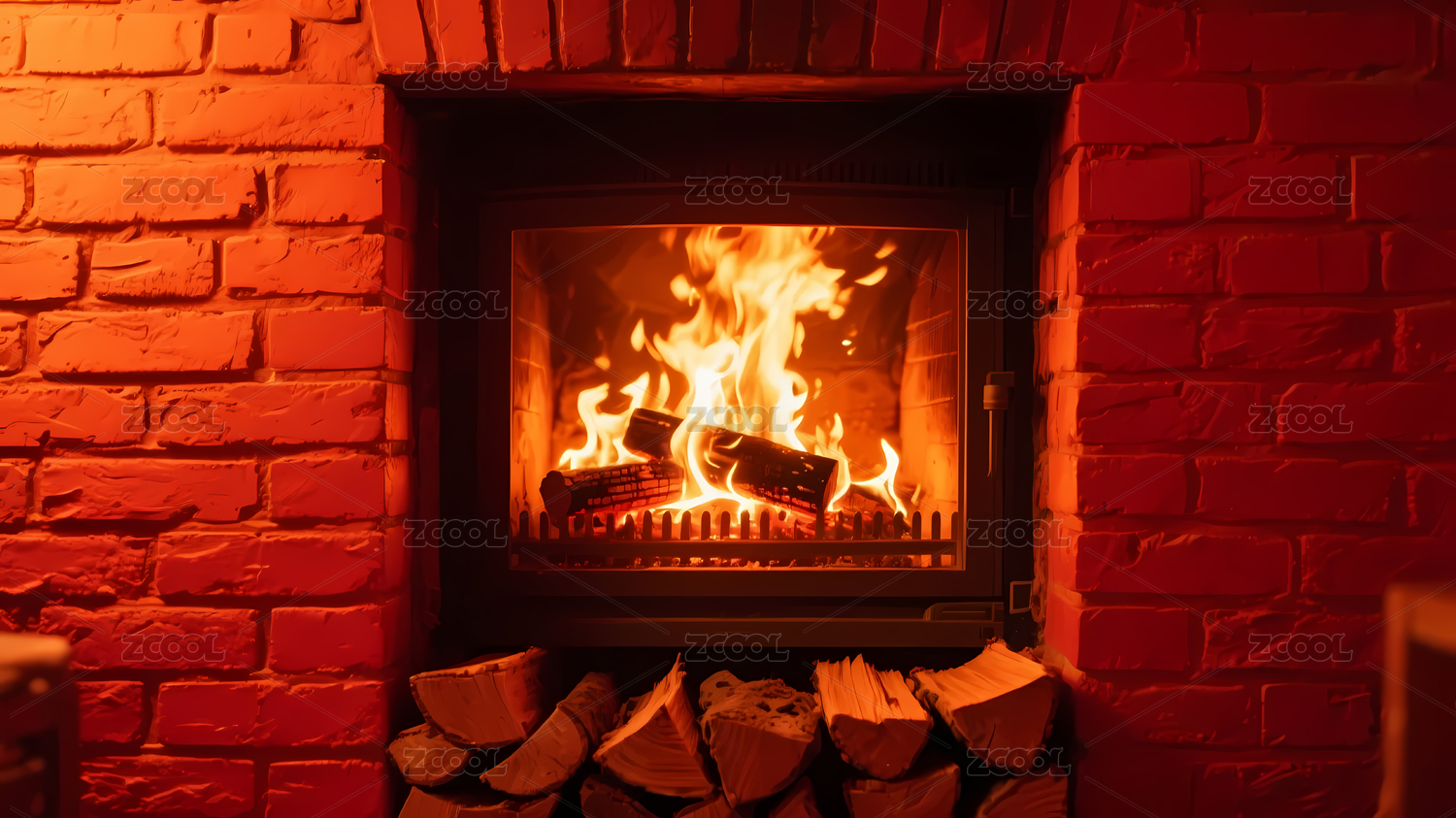 一座燃烧着炉火的欧美风格的古朴壁炉