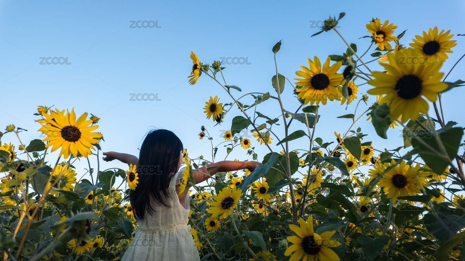 旅行女孩蹲在花田中欣赏向日葵的背影