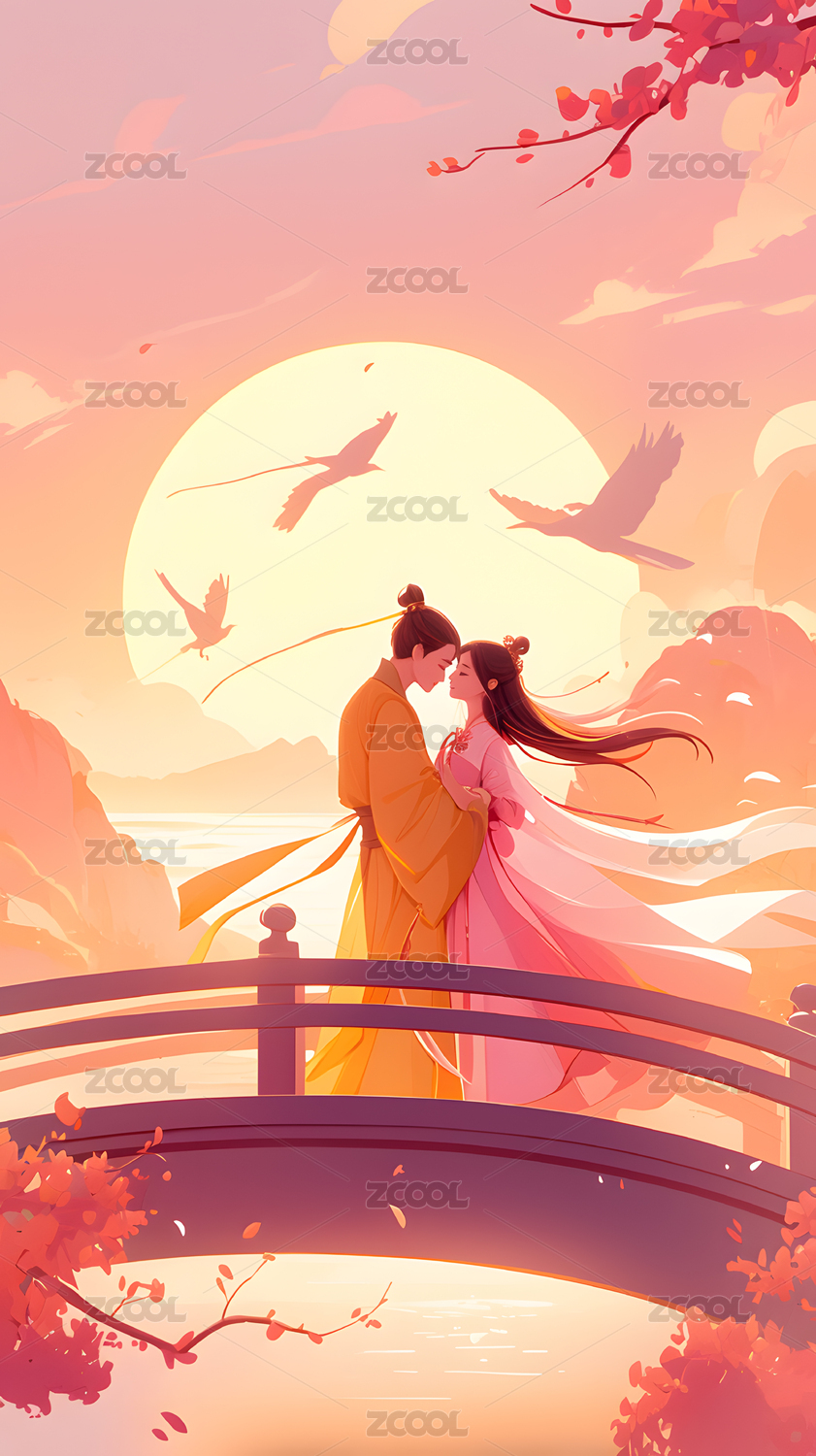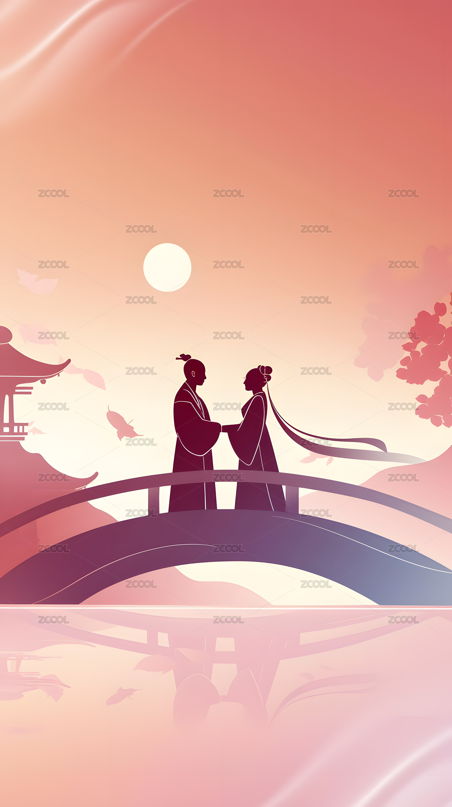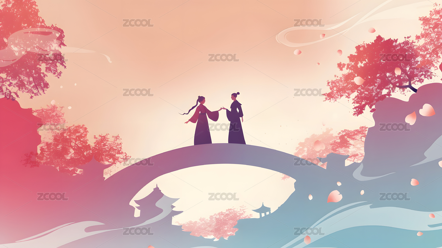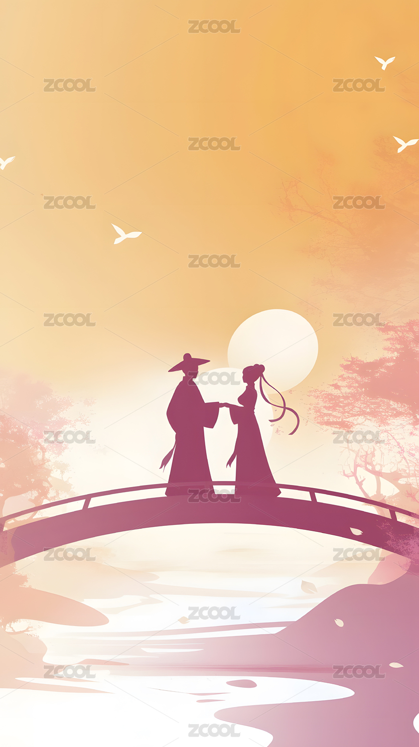 中国风,情侣,人物,插画,浪漫,爱情,桥,背景,唯美,艺术