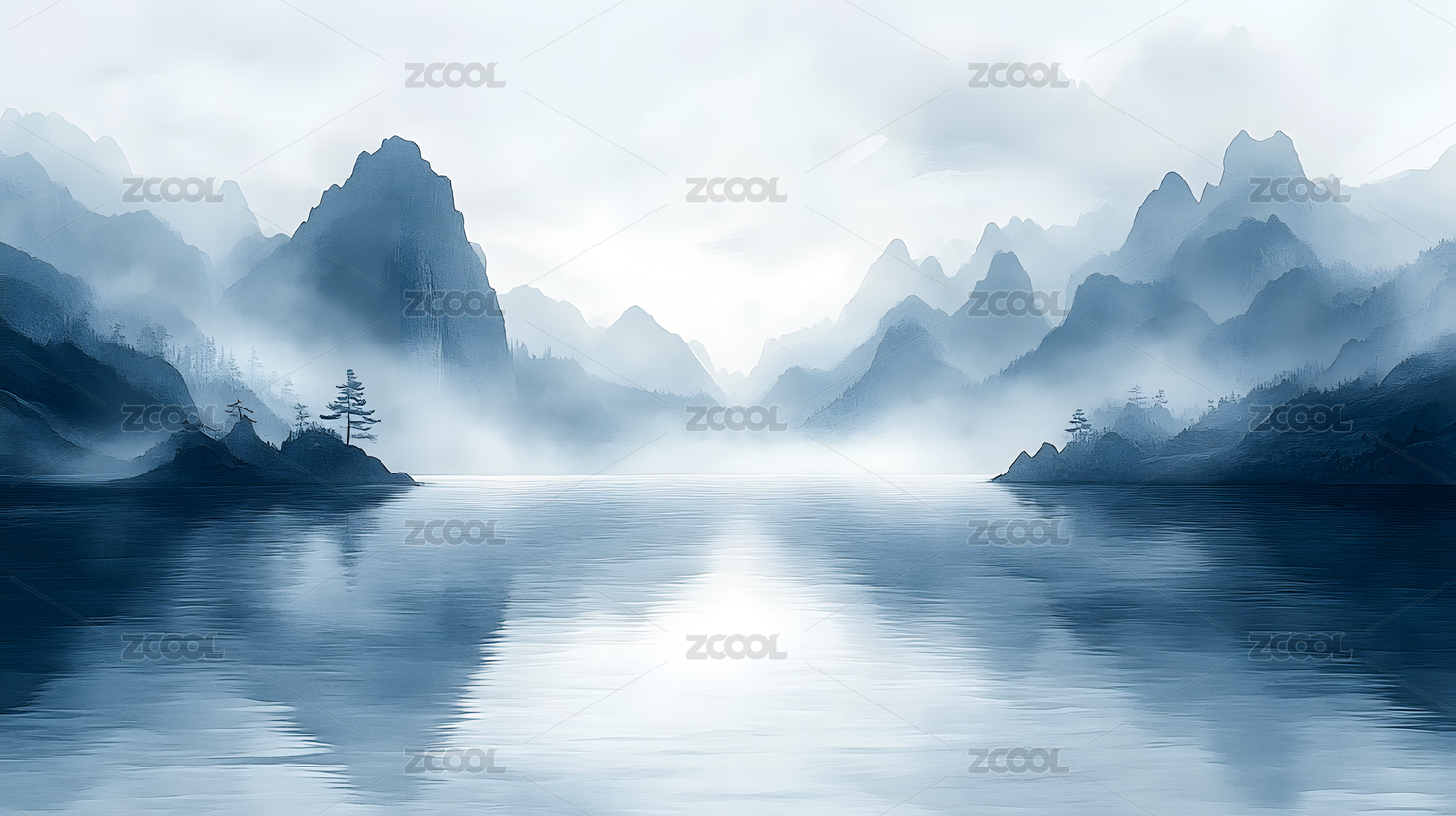 蓝色调的水墨风山水画,水墨风意境山水画概