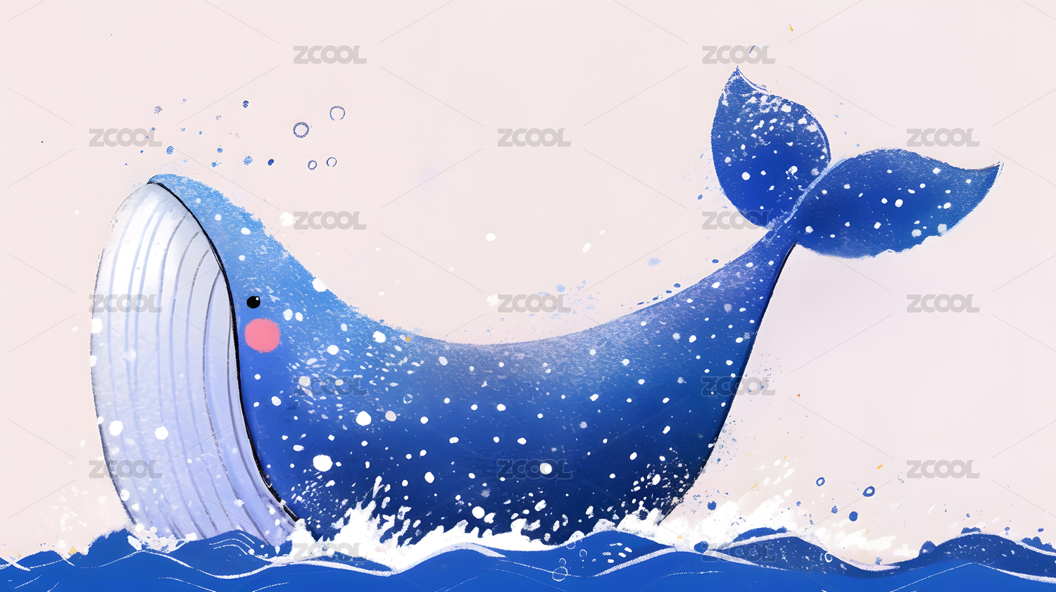 治愈系唯美插画一条蓝色的鲸鱼在遨游