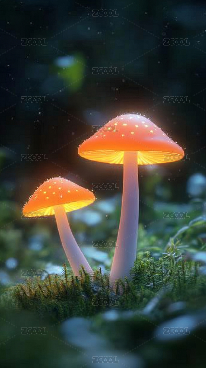 森林深处的梦幻蘑菇 荧光蘑菇的奇幻夜
