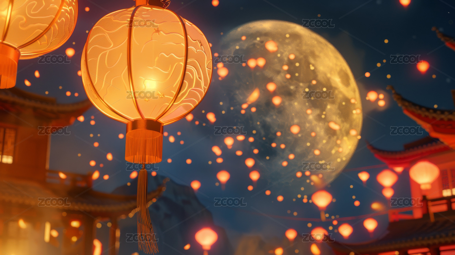 夜晚挂着传统红灯笼的中国古典建筑插画绘画