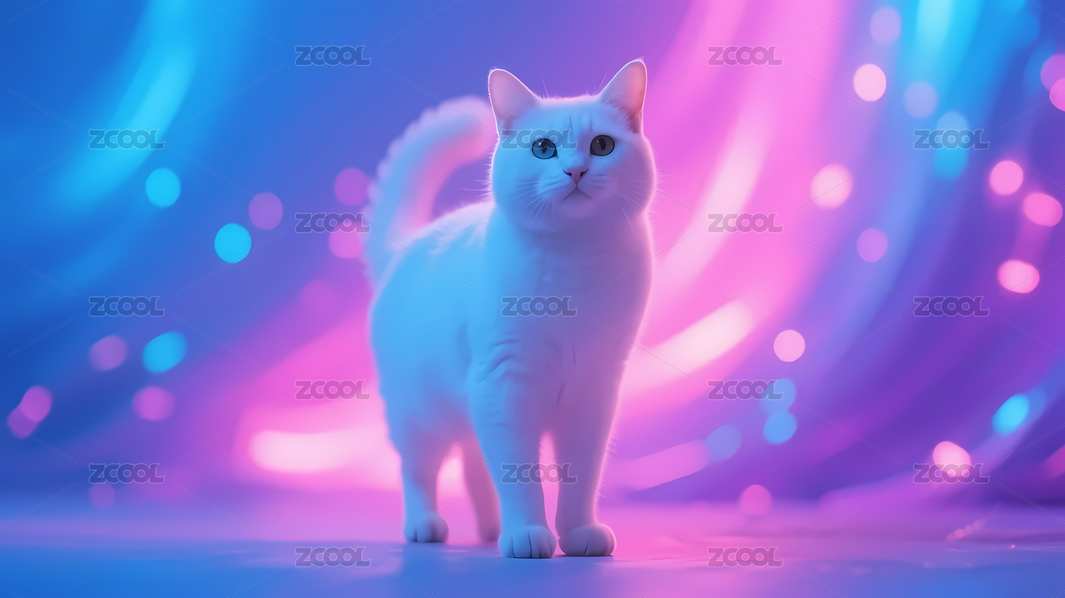 梦幻霓虹灯下的白猫