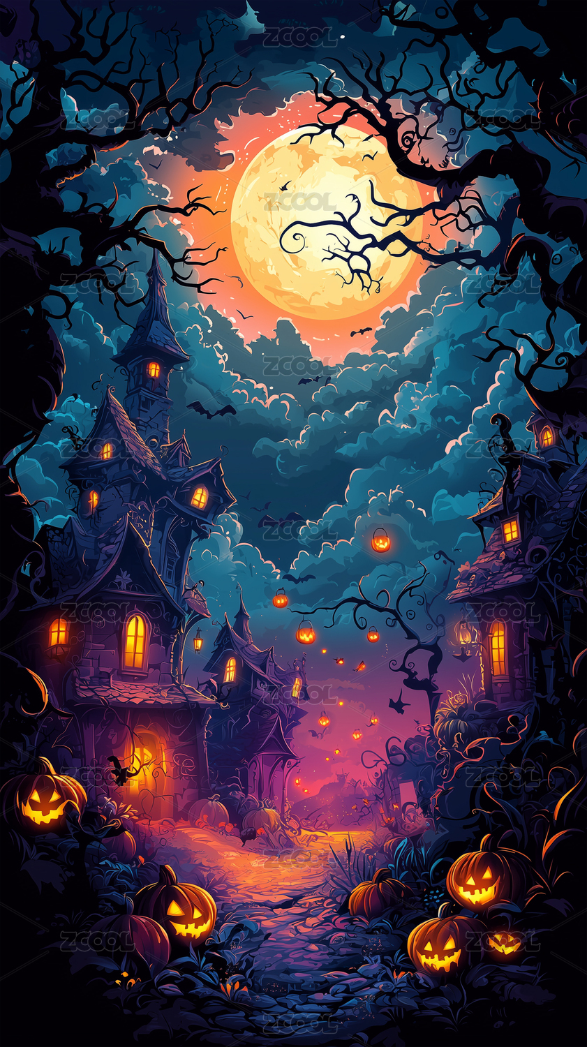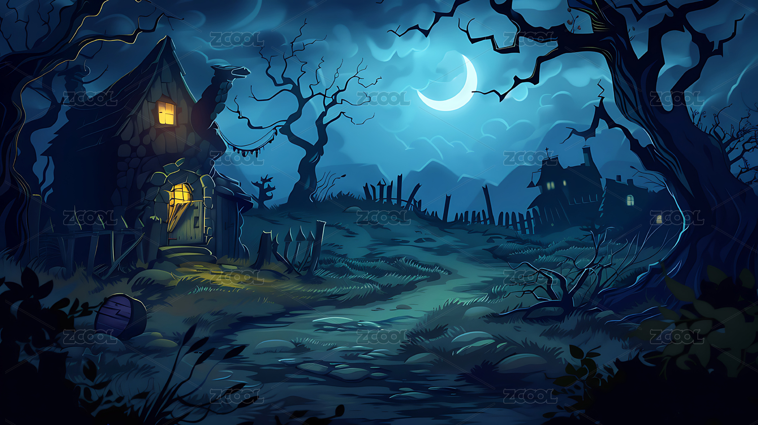 万圣节恐怖房屋夜晚城堡复古装饰节日插画