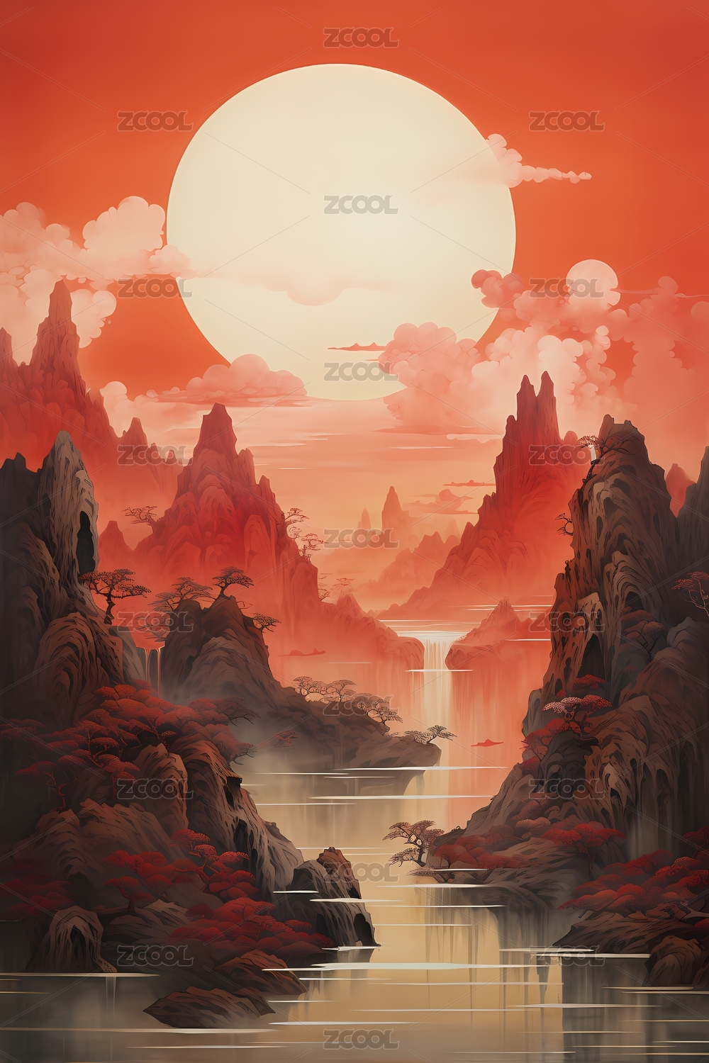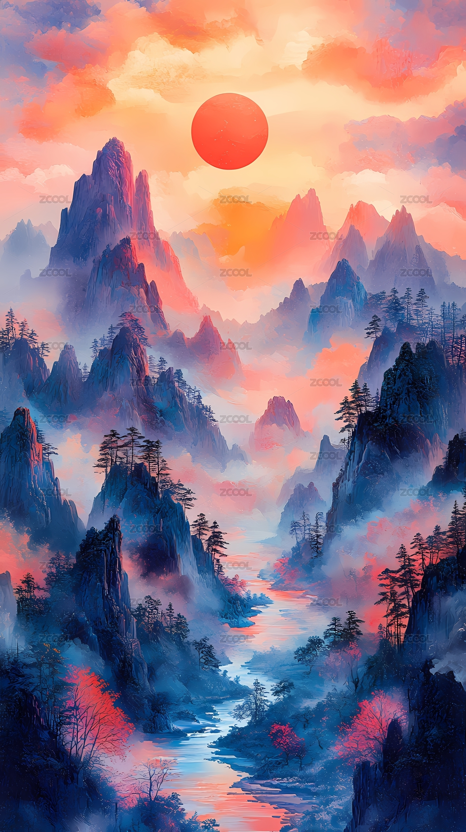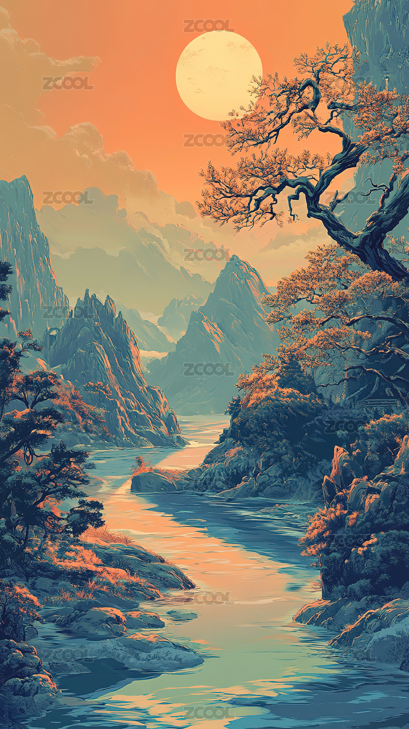 中国,山水,色彩,山,松树,云,插画,海报,抽象,艺术