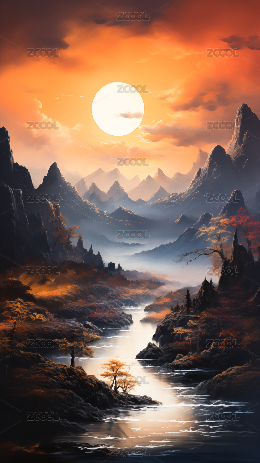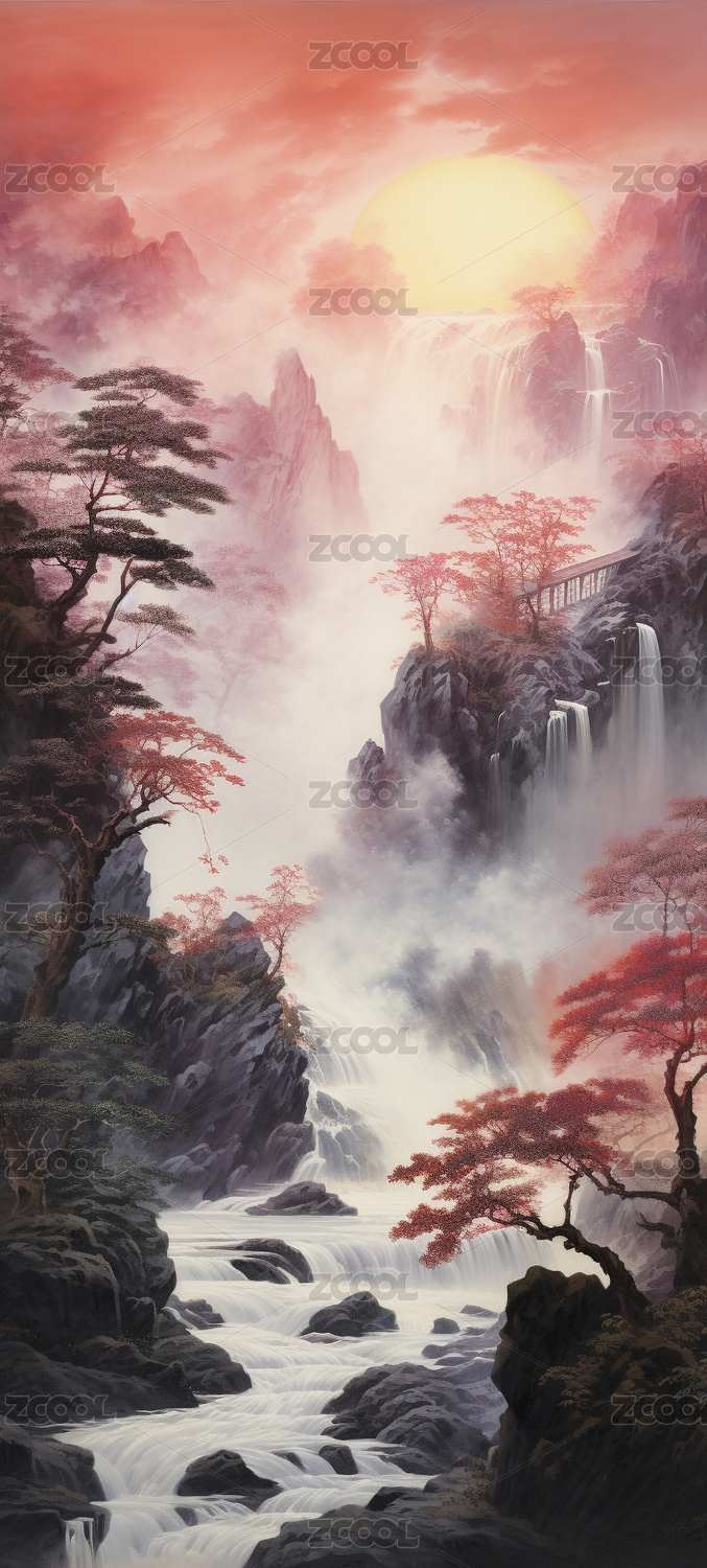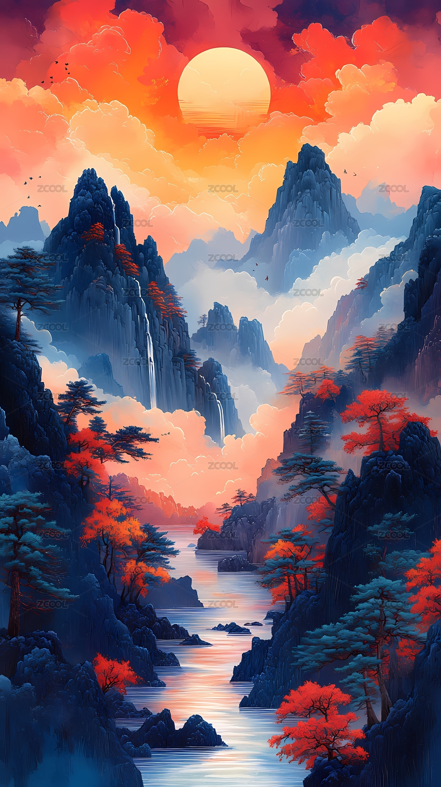 中国,山水,色彩,山,松树,云,插画,海报,抽象,艺术