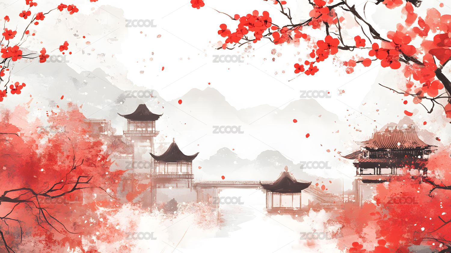 山水,云雾,古,建筑,红梅,树枝,花瓣,山峰,雾气,房屋
