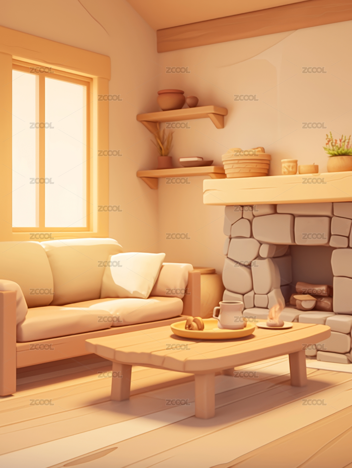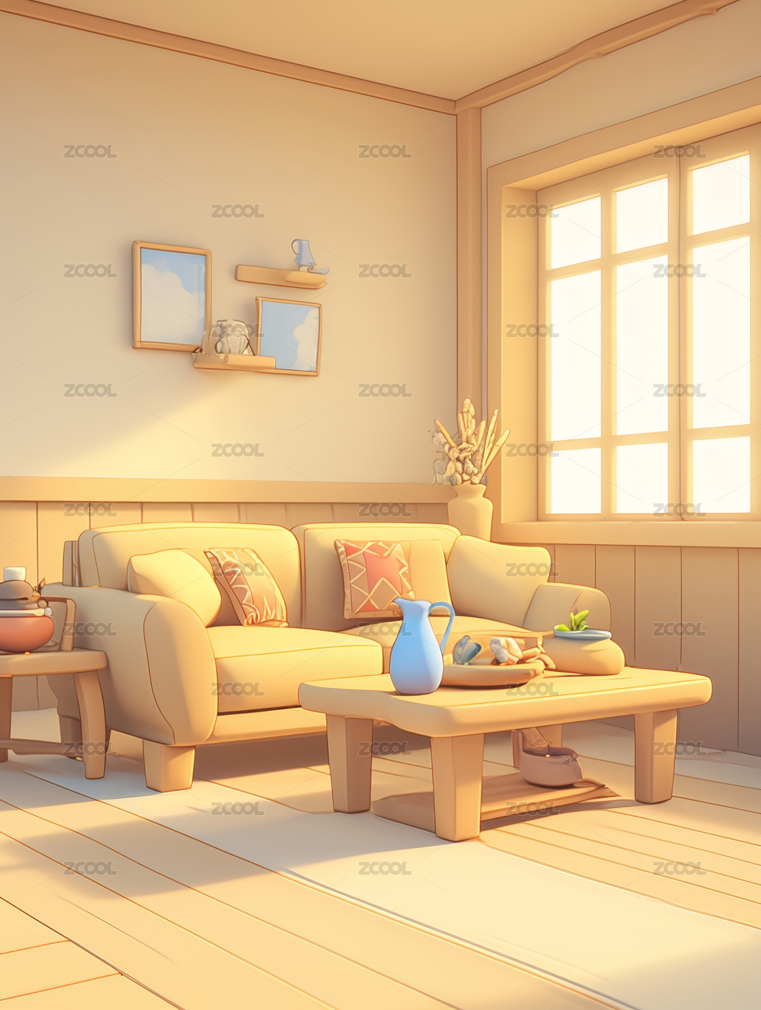 暖色客厅装修俯视立体轴测图3D卡通插画