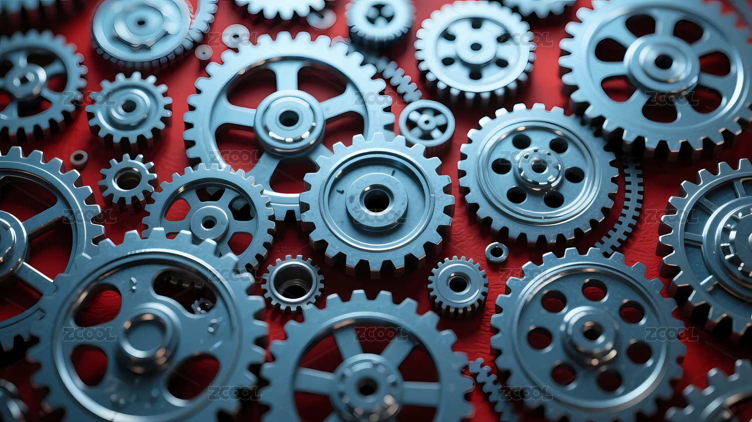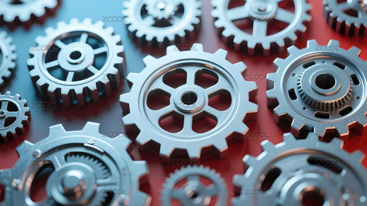 银色齿轮冷蓝红背景