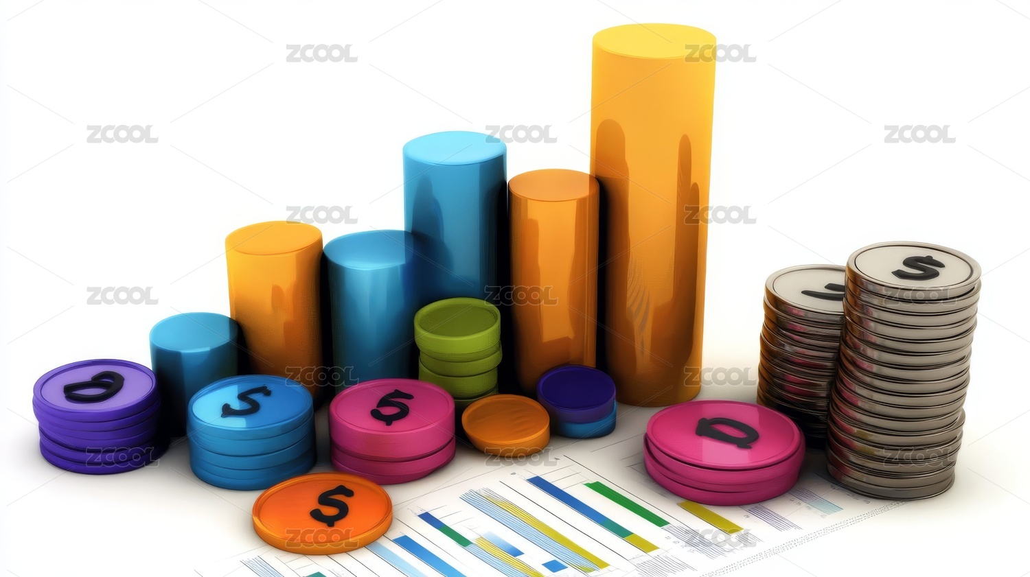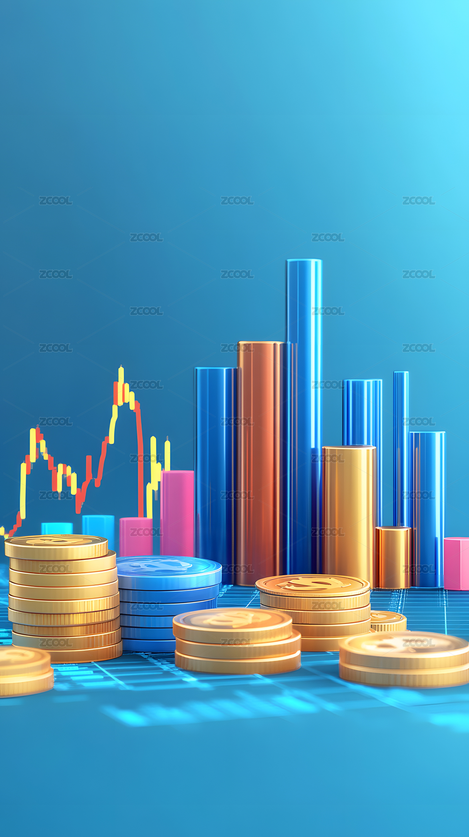 硬币与彩色柱状图的金融图景