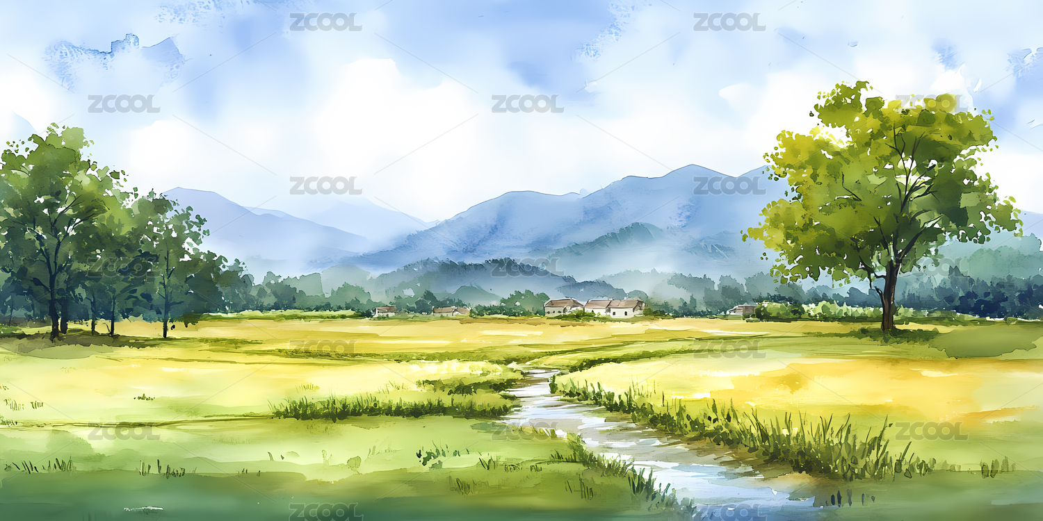 自然, 风景, 宁静, 绿色, 山脉, 草地, 清新, 乡村,水彩画, 蓝天