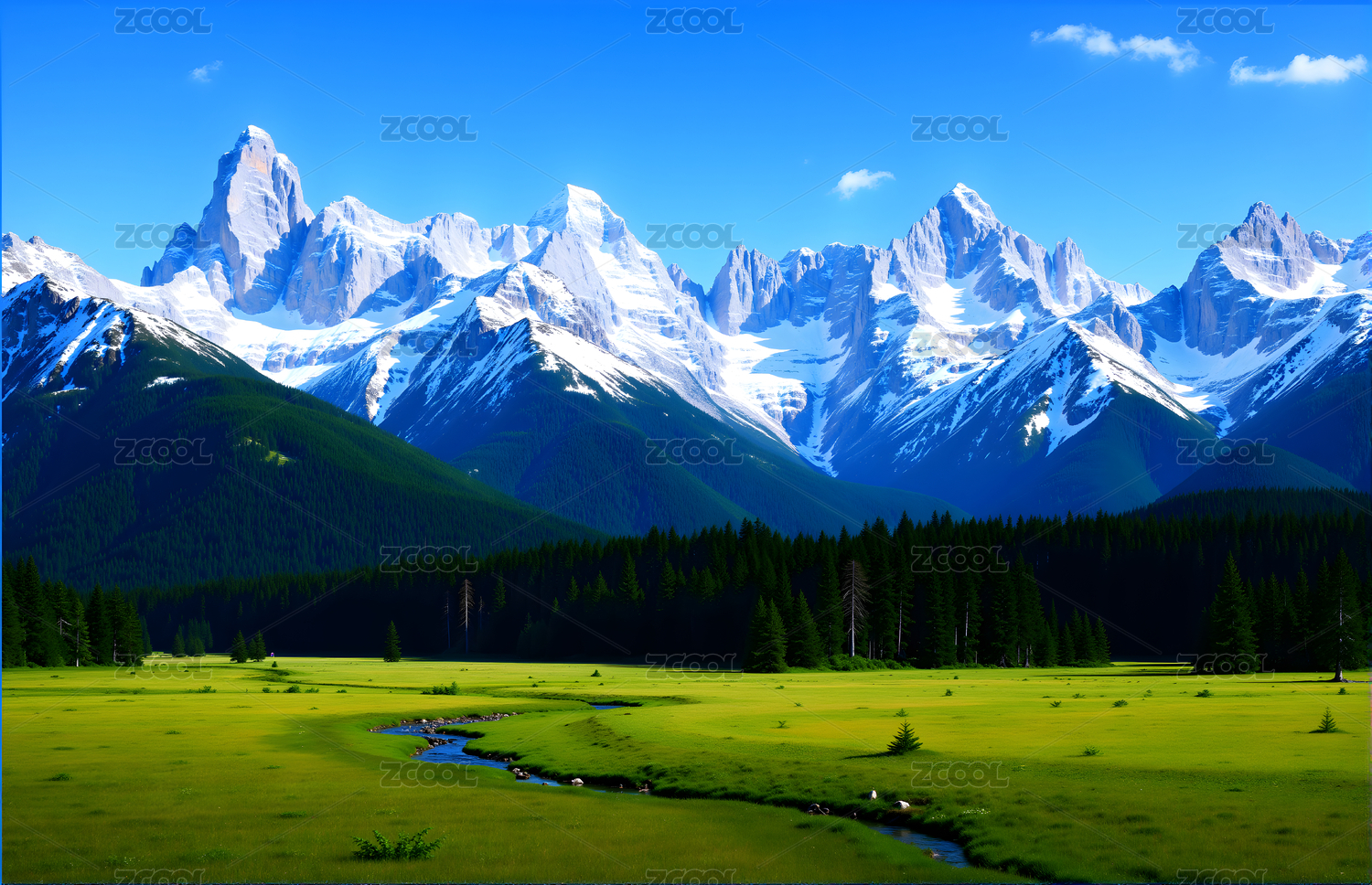 雪山草地河流