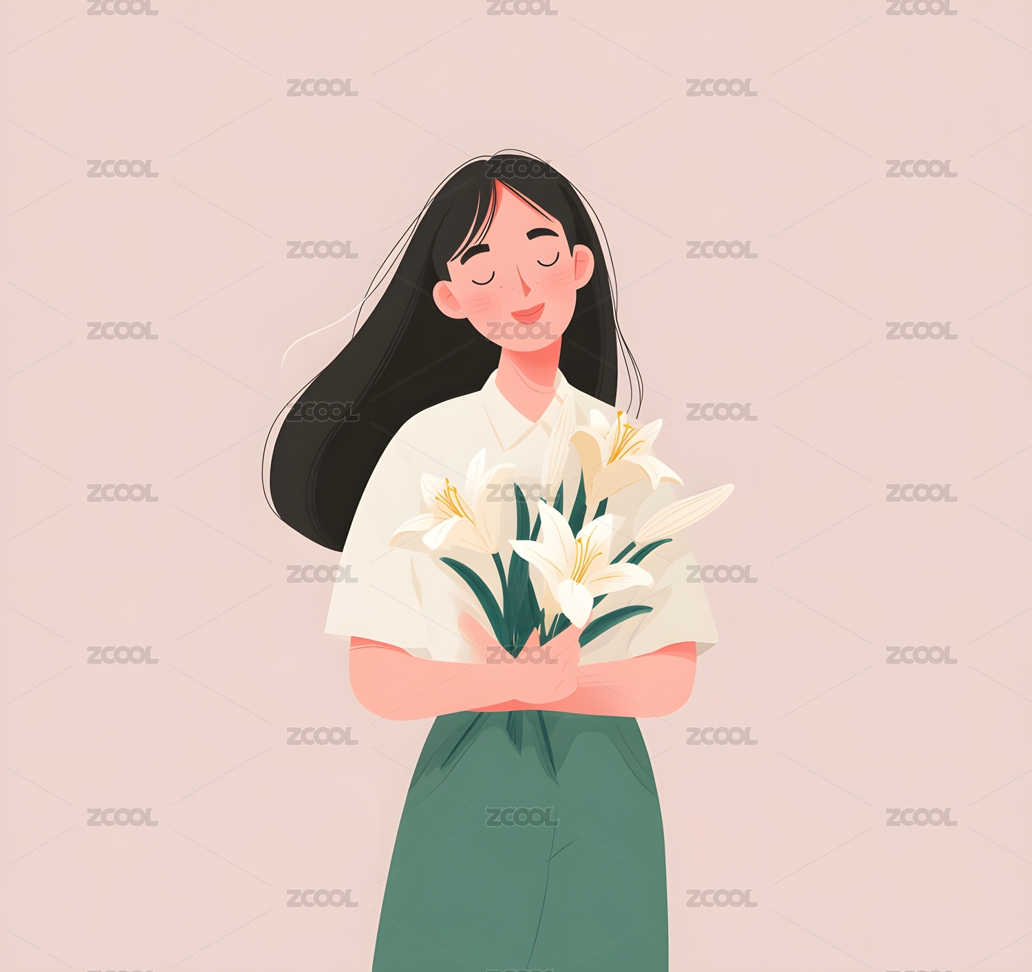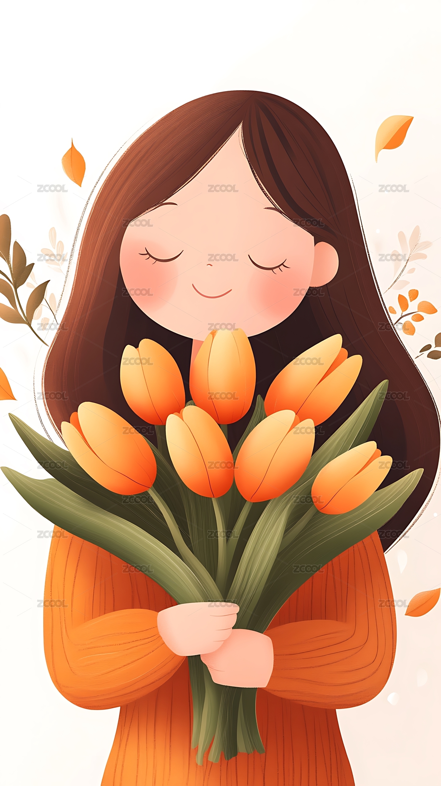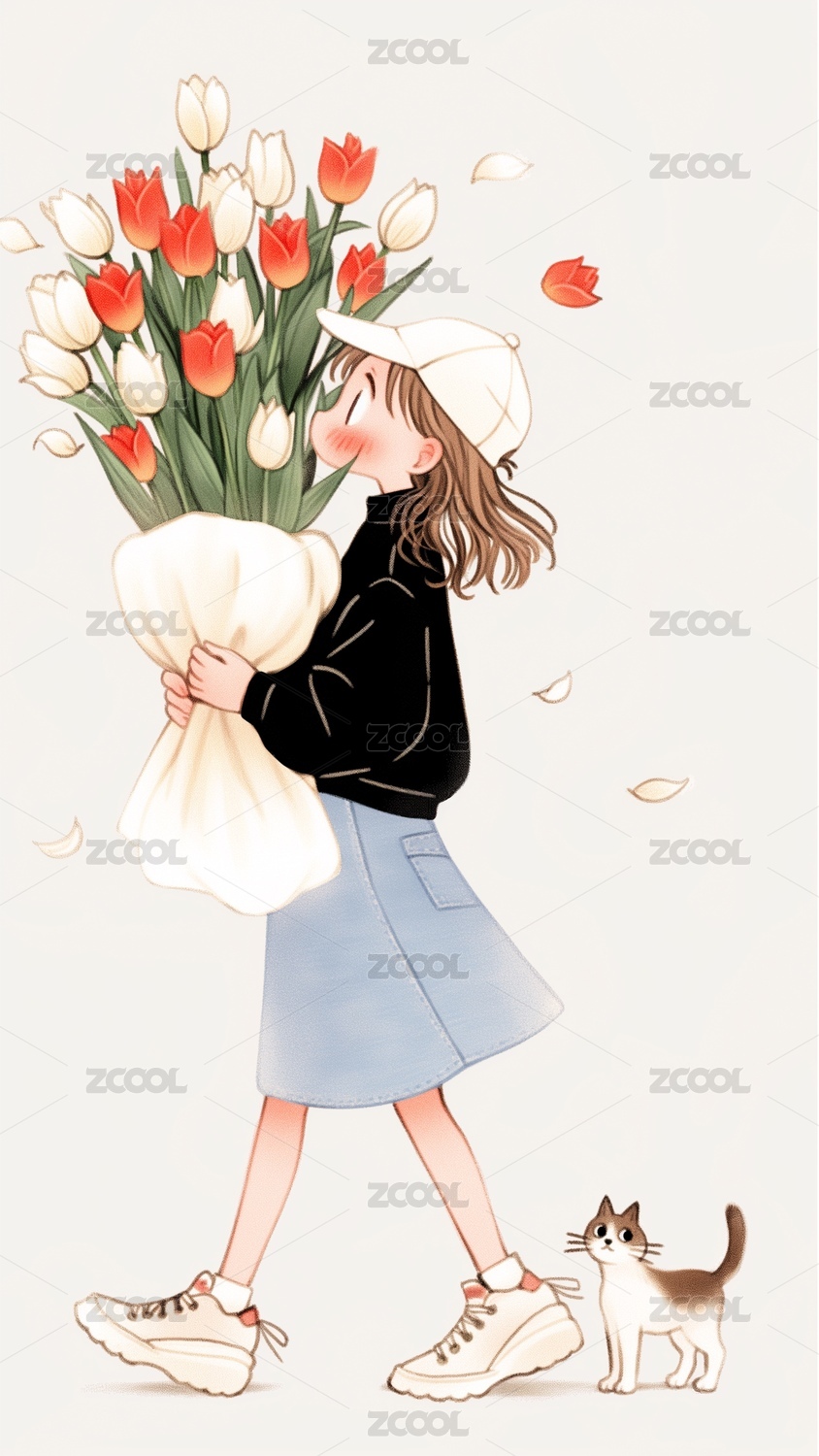 鲜花,女孩,拥抱,花束,治愈,温暖,幸福,清新,文艺,插画