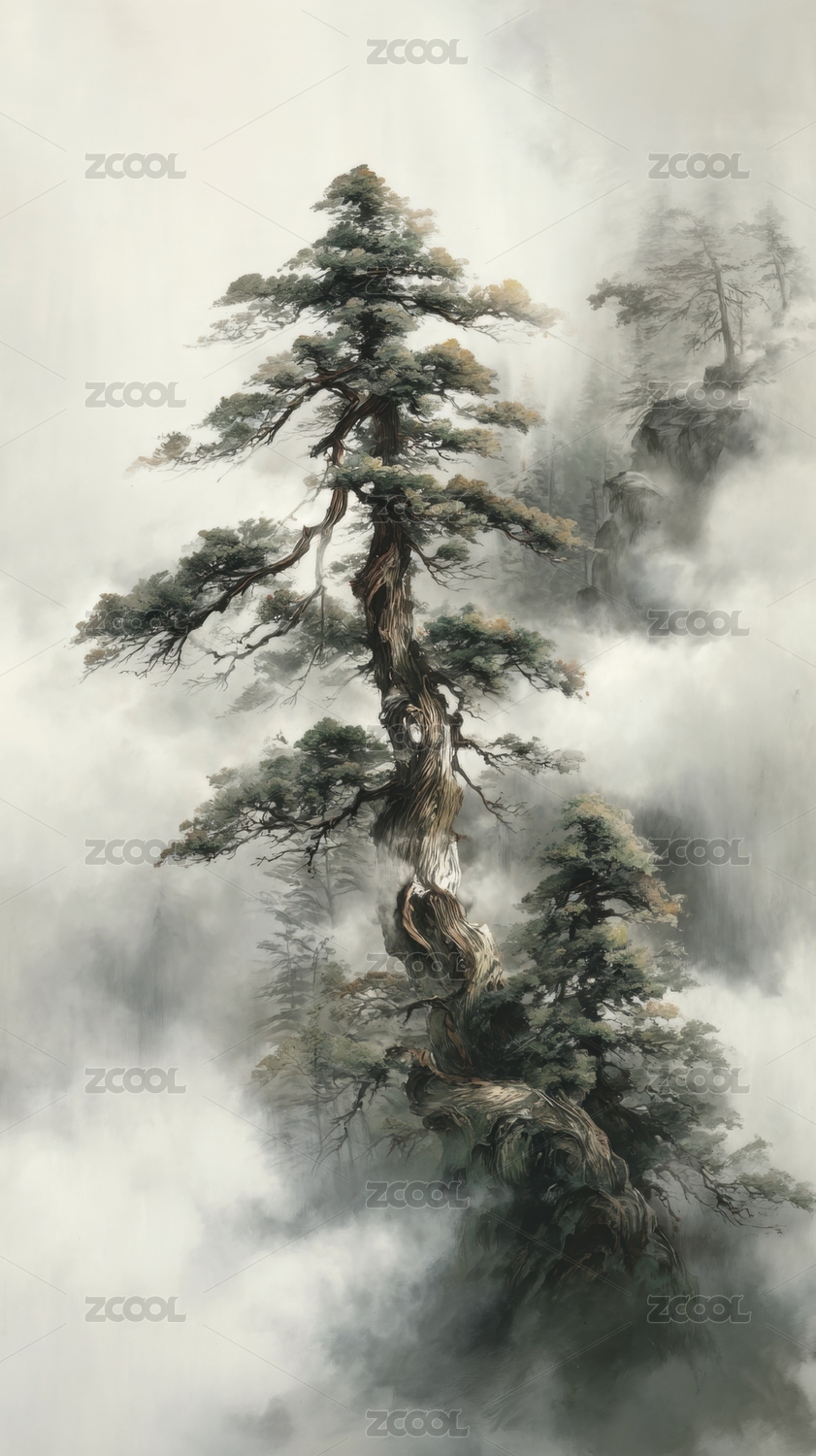 山水云雾间松树傲立的东方意境画