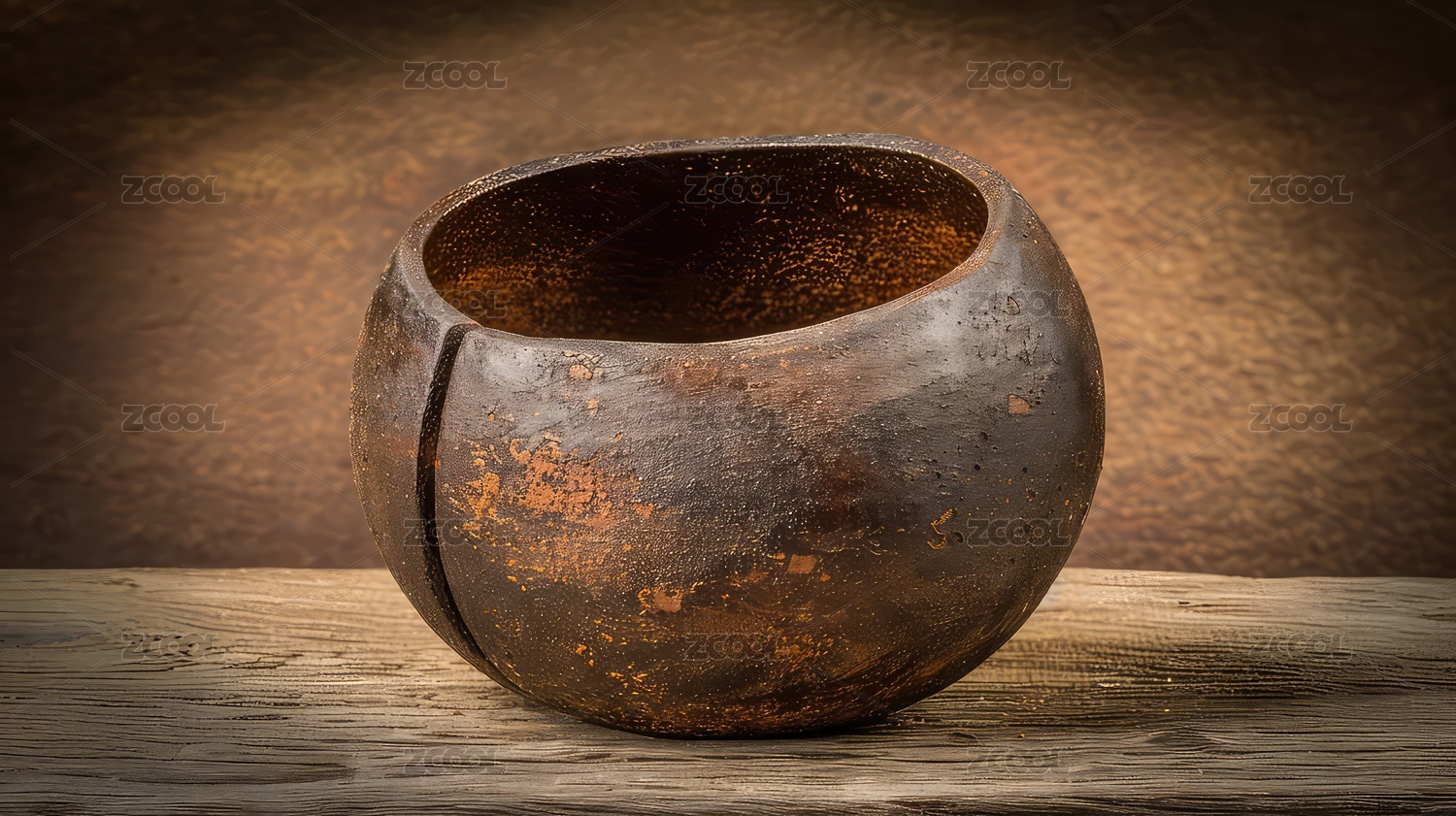一个古朴的木碗放在木质的桌面上面