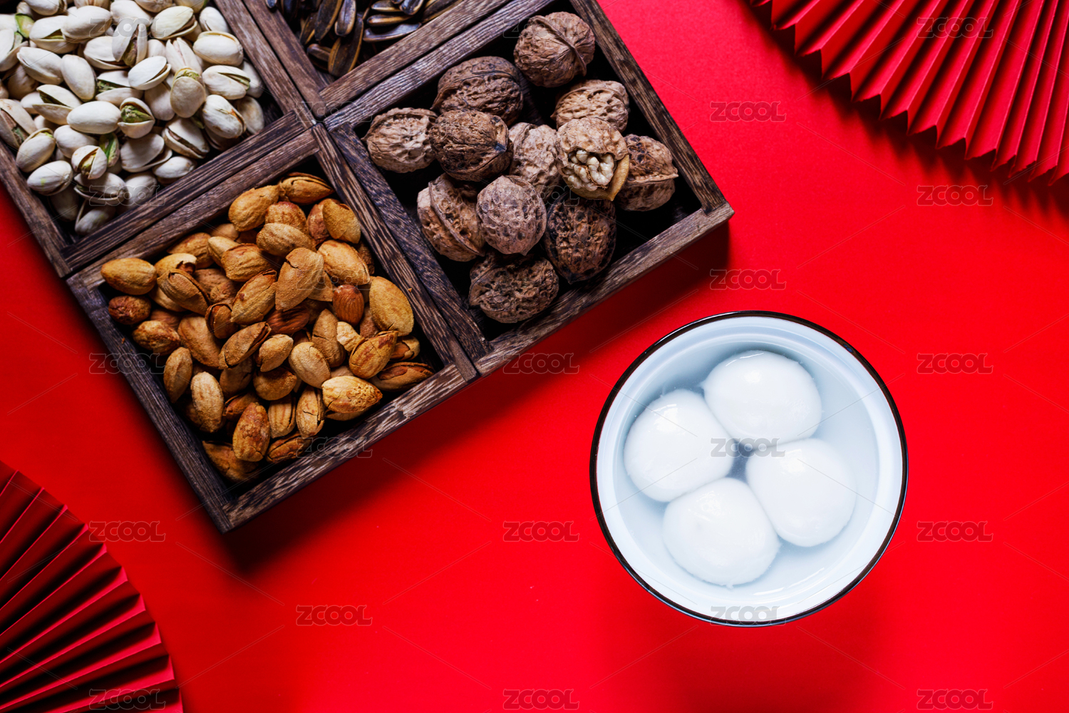 红色背景下的白色汤圆与装饰