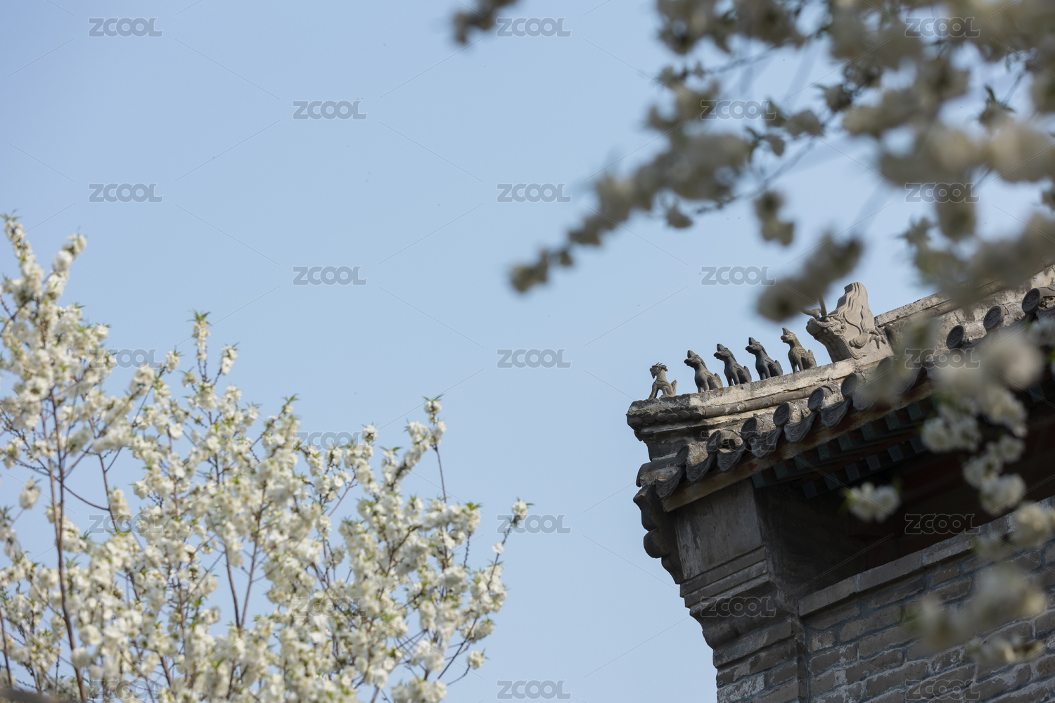 桃花(碧桃)与古建筑屋檐脊兽