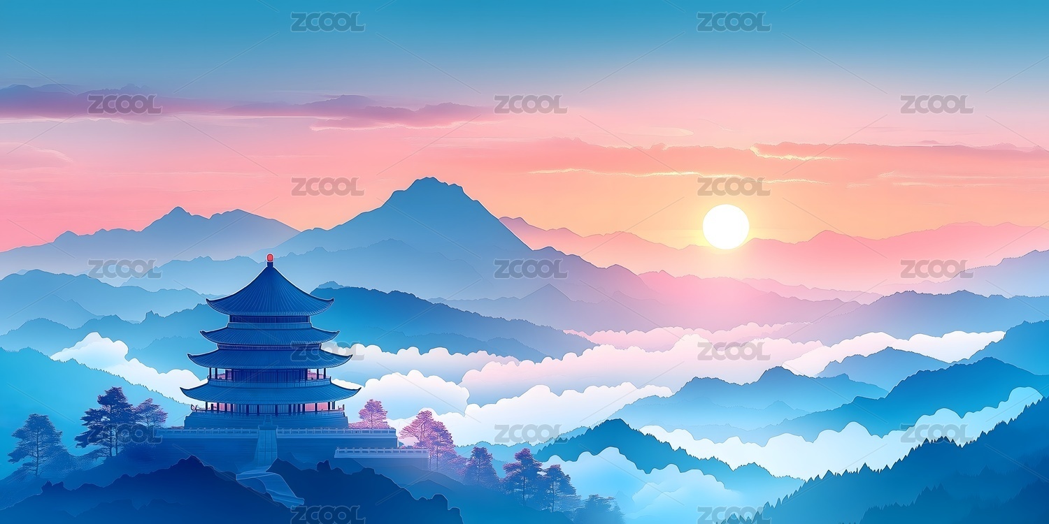 自然, 风景, 安详, 宁静, 蓝色, 美丽, 树木, 山峰, 红色, 水彩