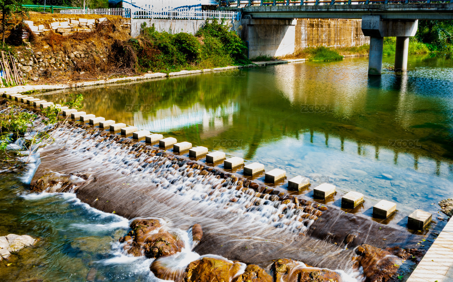 中国浙江省杭州市乡村溪流阶梯式人工瀑布
