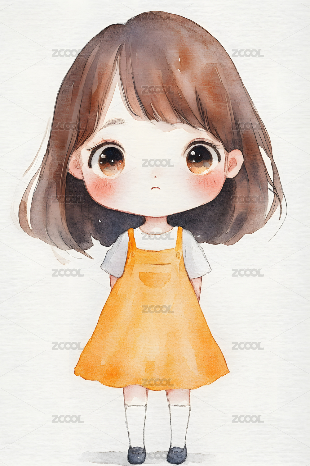 卡通女孩黑发橙色衬衫头上绿叶高清图片