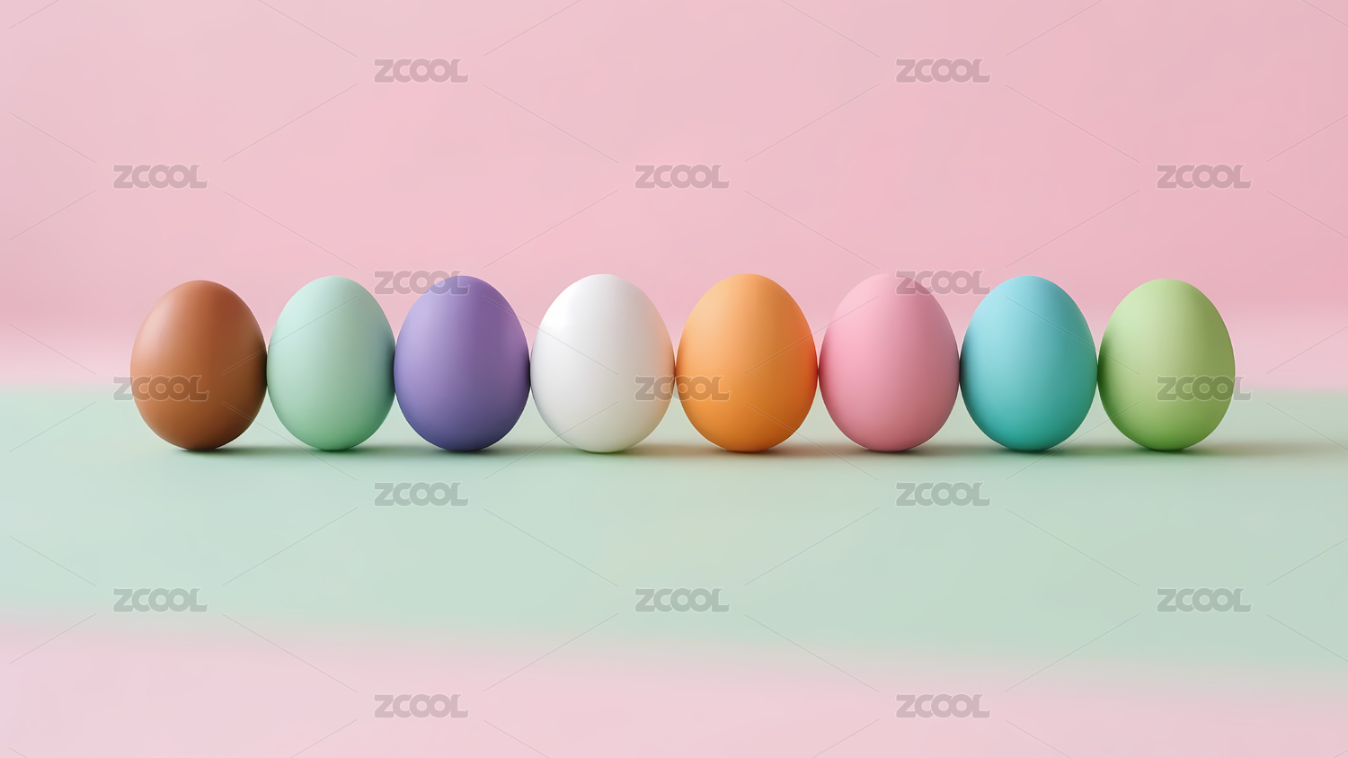 粉红色背景上一组彩色鸡蛋的特写高清图片