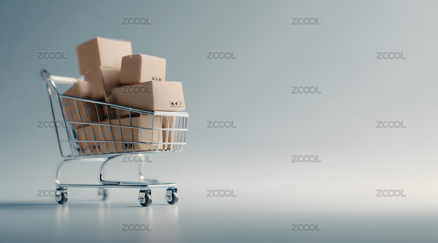 蓝色背景下装满快递纸箱的购物车