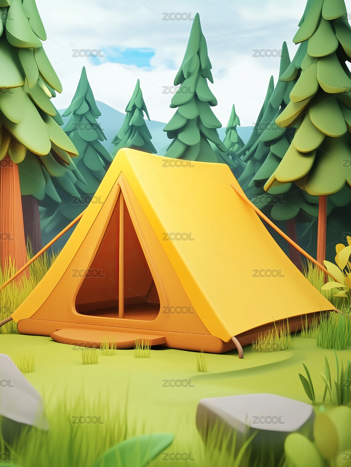 低面多边形夏天绿色草地的露营帐篷3D插画