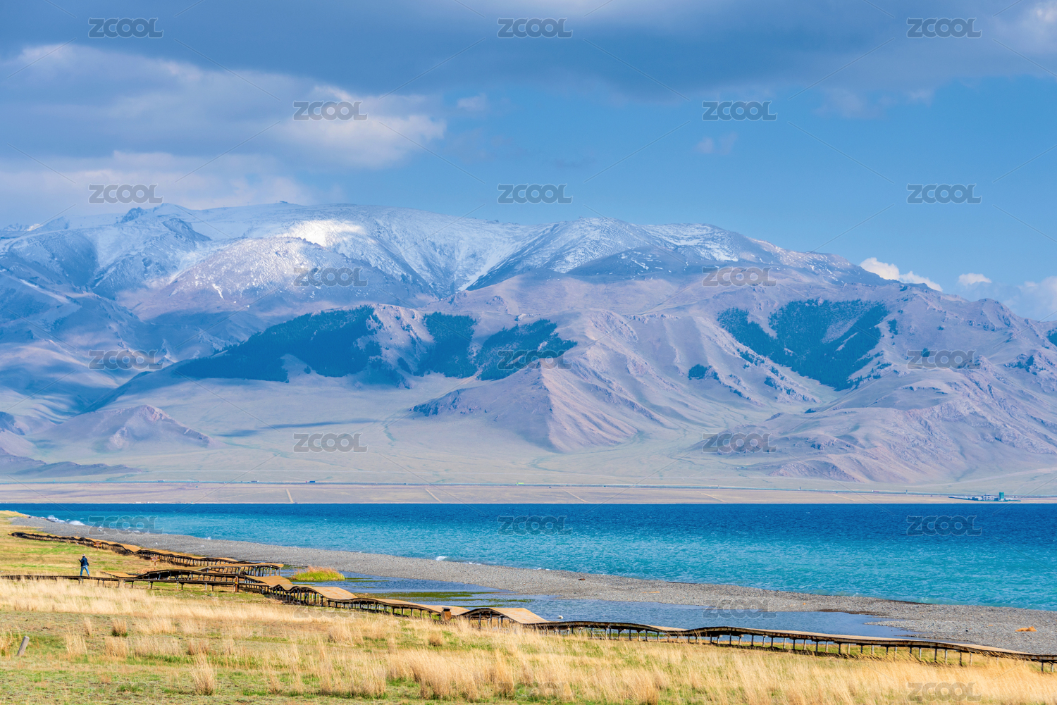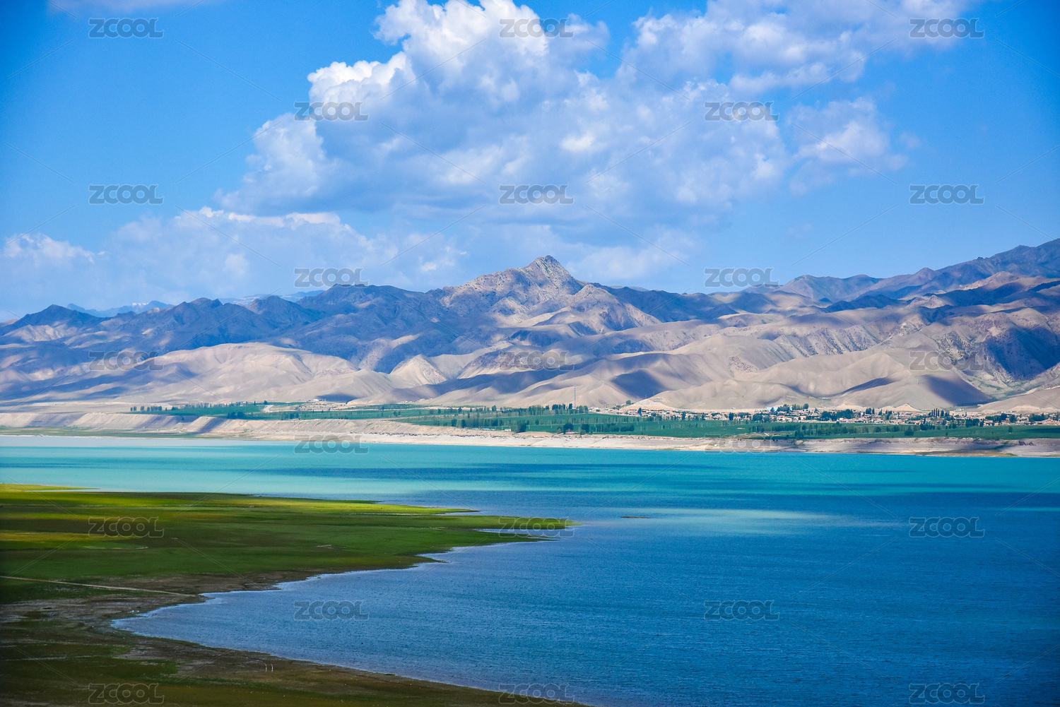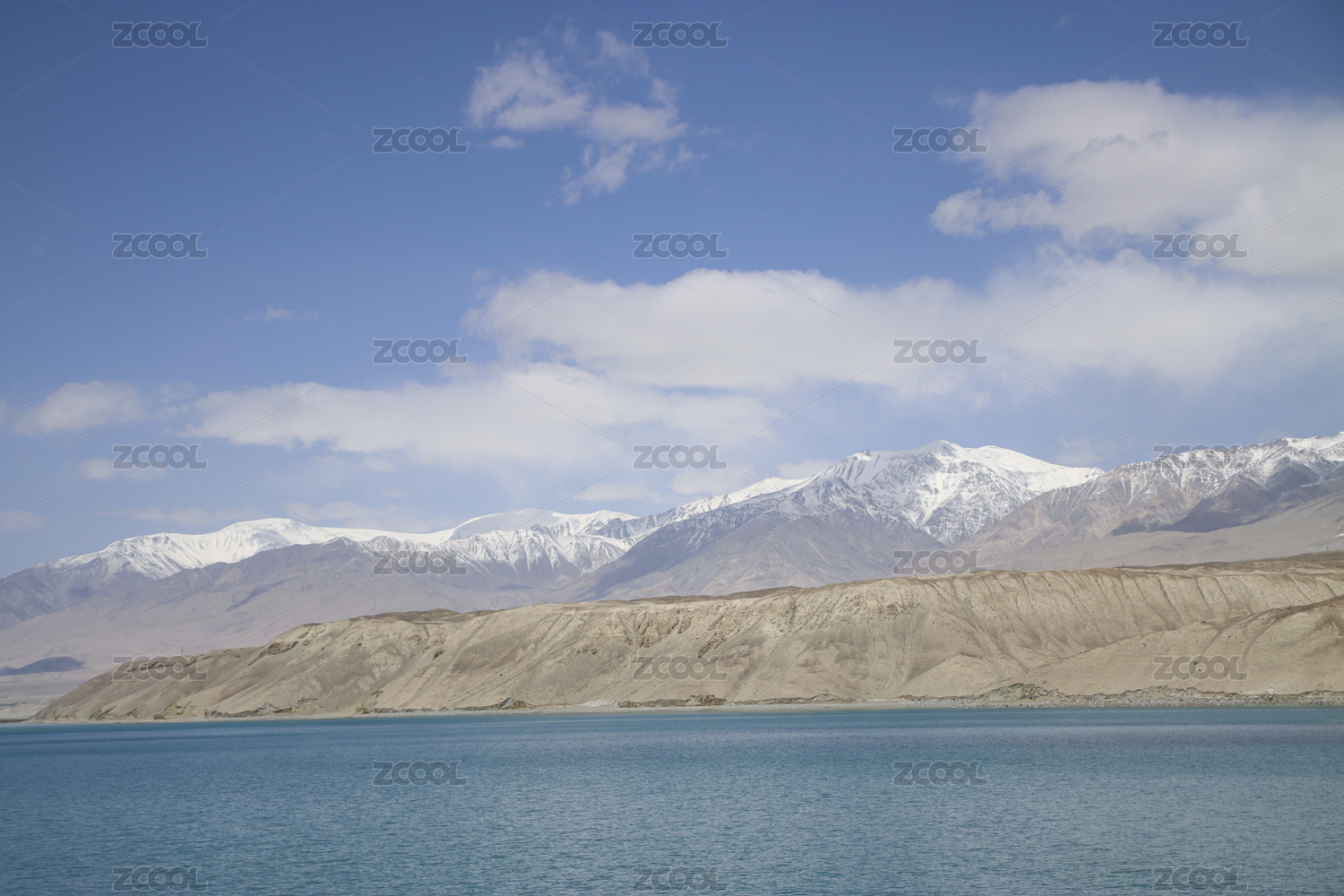 中国新疆湖水与群山蓝天白云自然风景