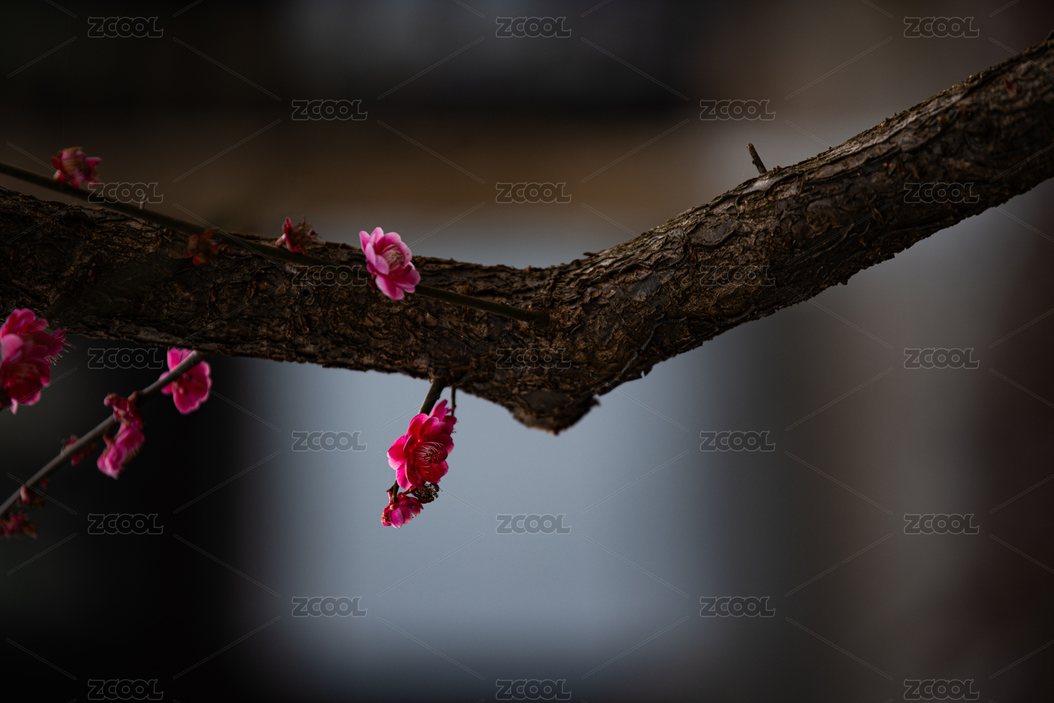 粉红色梅花深色背景虚化特写