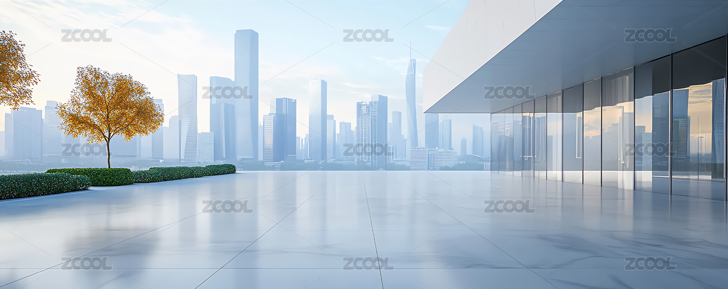 现代建筑与混凝土地面以城市天际线为背景