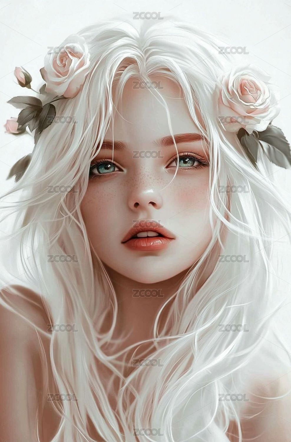 白发玫瑰女孩浪漫唯美动漫海报油画壁纸
