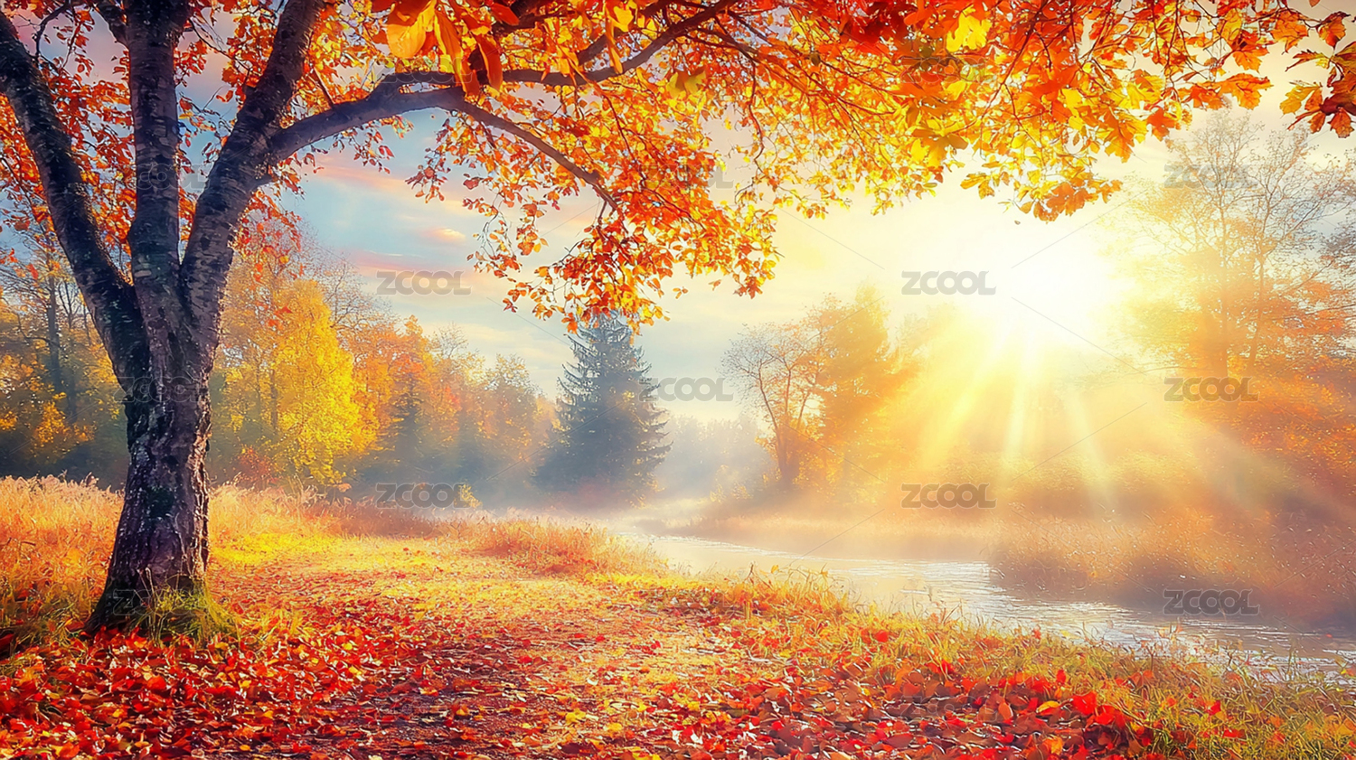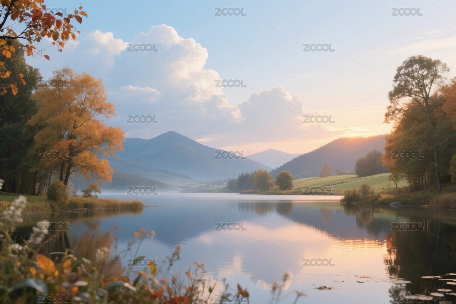 秋季湖泊金黄树叶自然风景治愈壁纸插画